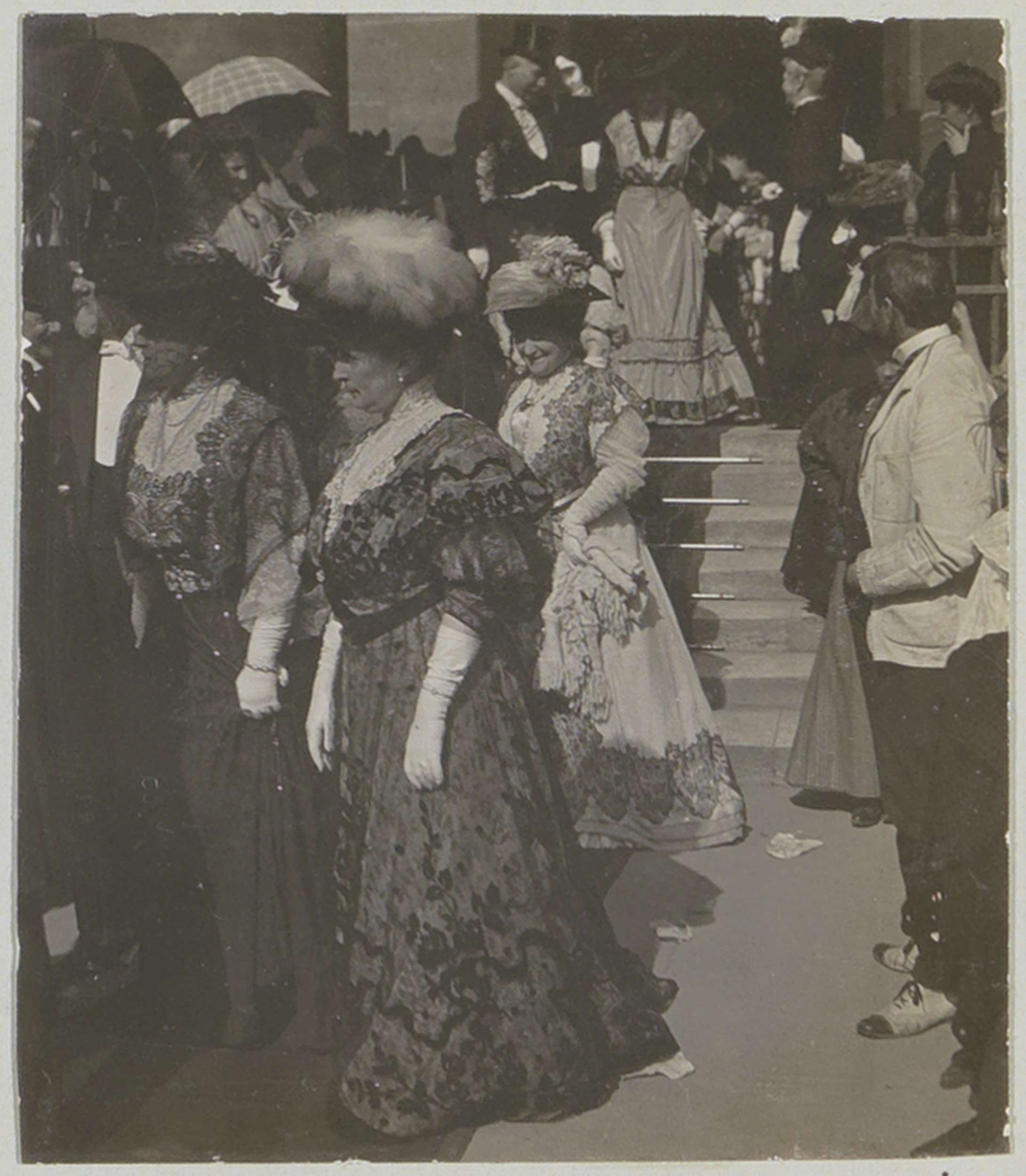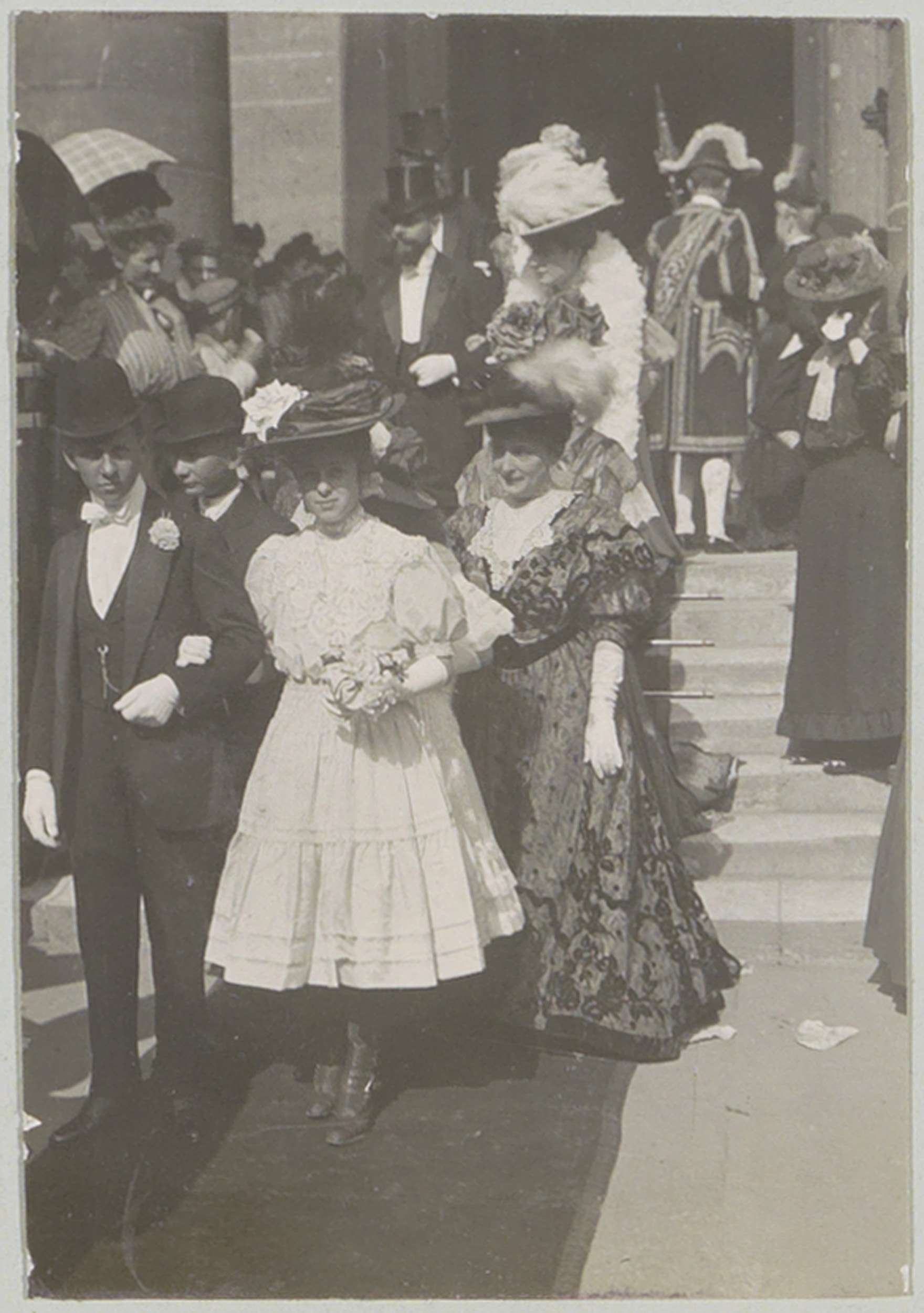 Bruiloftsgasten bij het verlaten van een gebouw, ver...