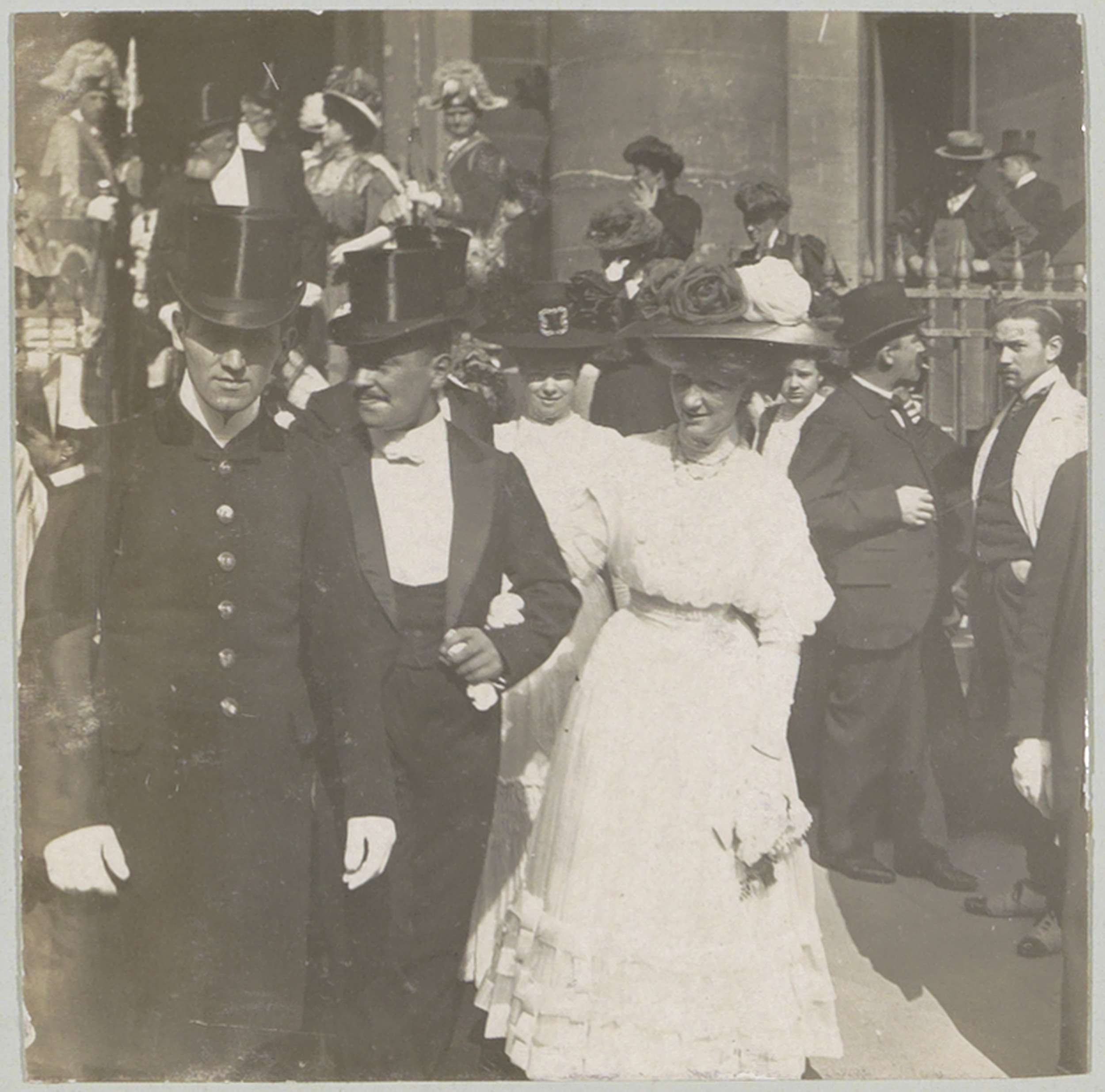 Bruidspaar bij het verlaten van een gebouw, vermoede...