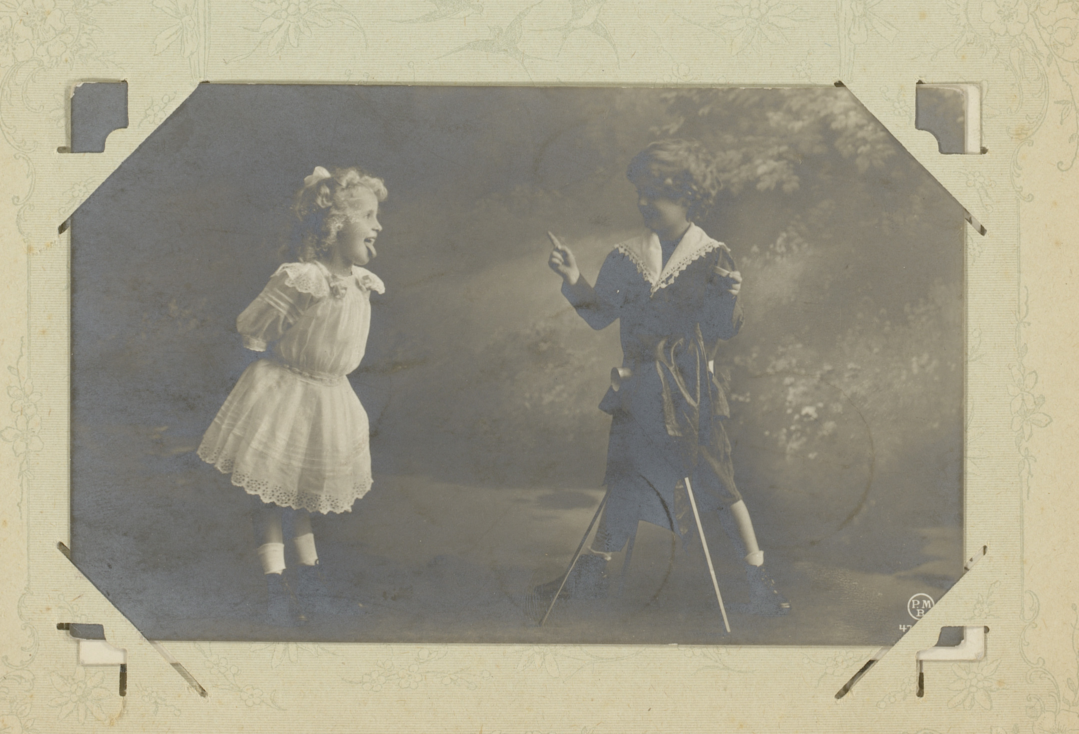 Meisje dat haar tong uitsteekt naar een jongen met e...