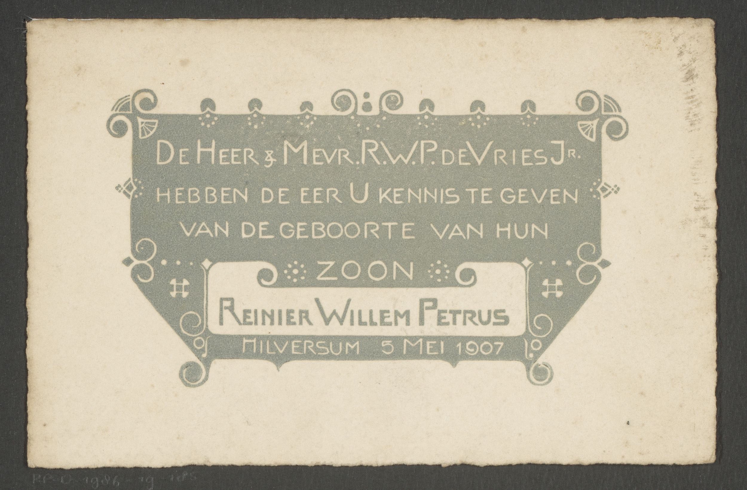 Geboortekaartje van Reinier Willem Petrus de Vries