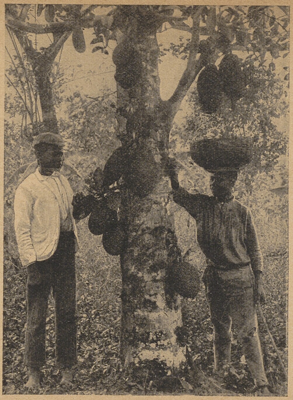 Mannen plukken het fruit van de boom, Artocarpus int...