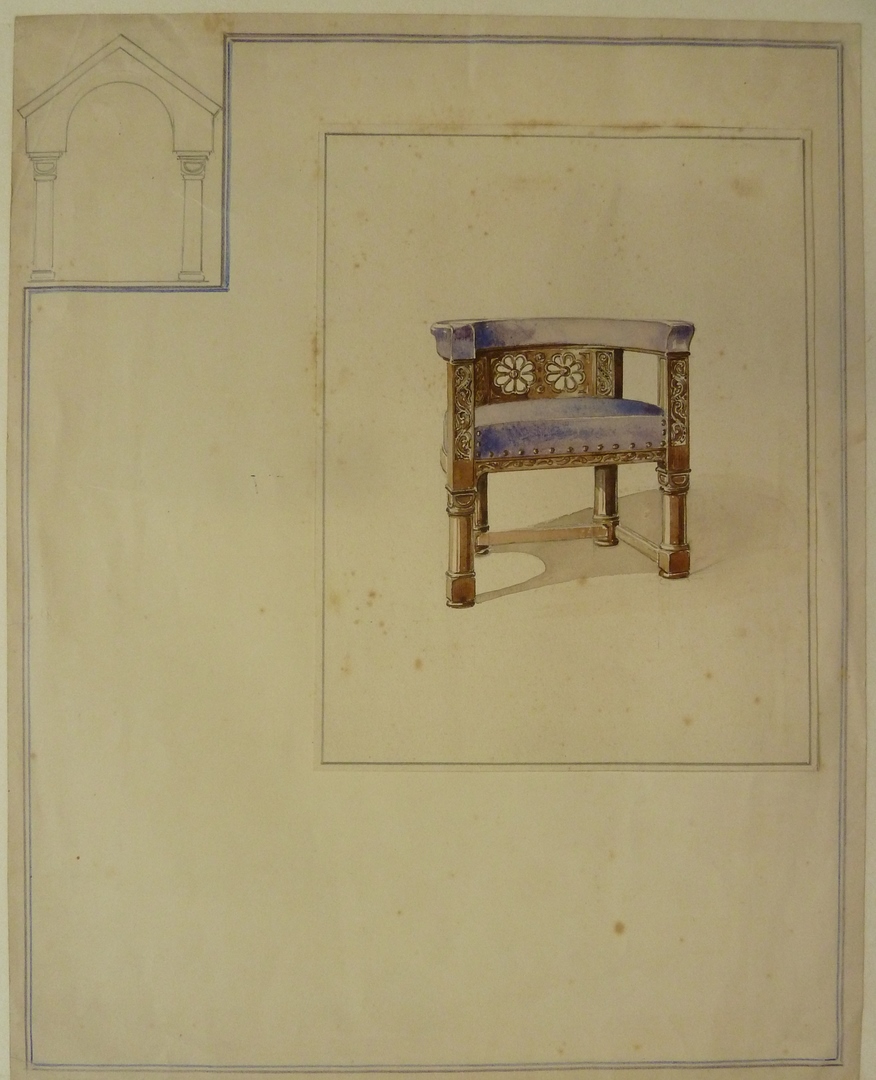 Stoel met paarse zitting en halfronde vorm, gebruikt...