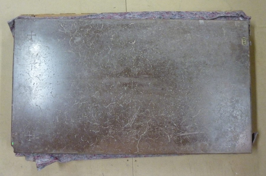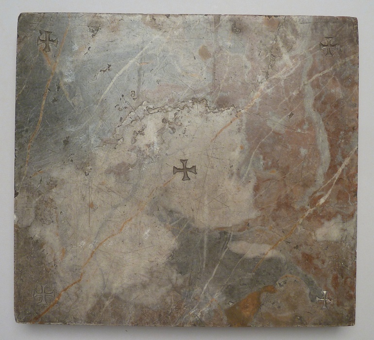 Altaarsteen met vijf kruisjes, van gekleurd geaderd ...