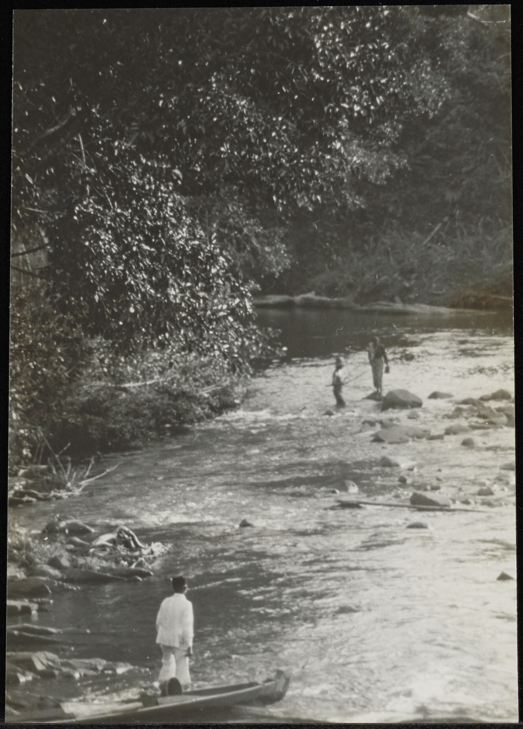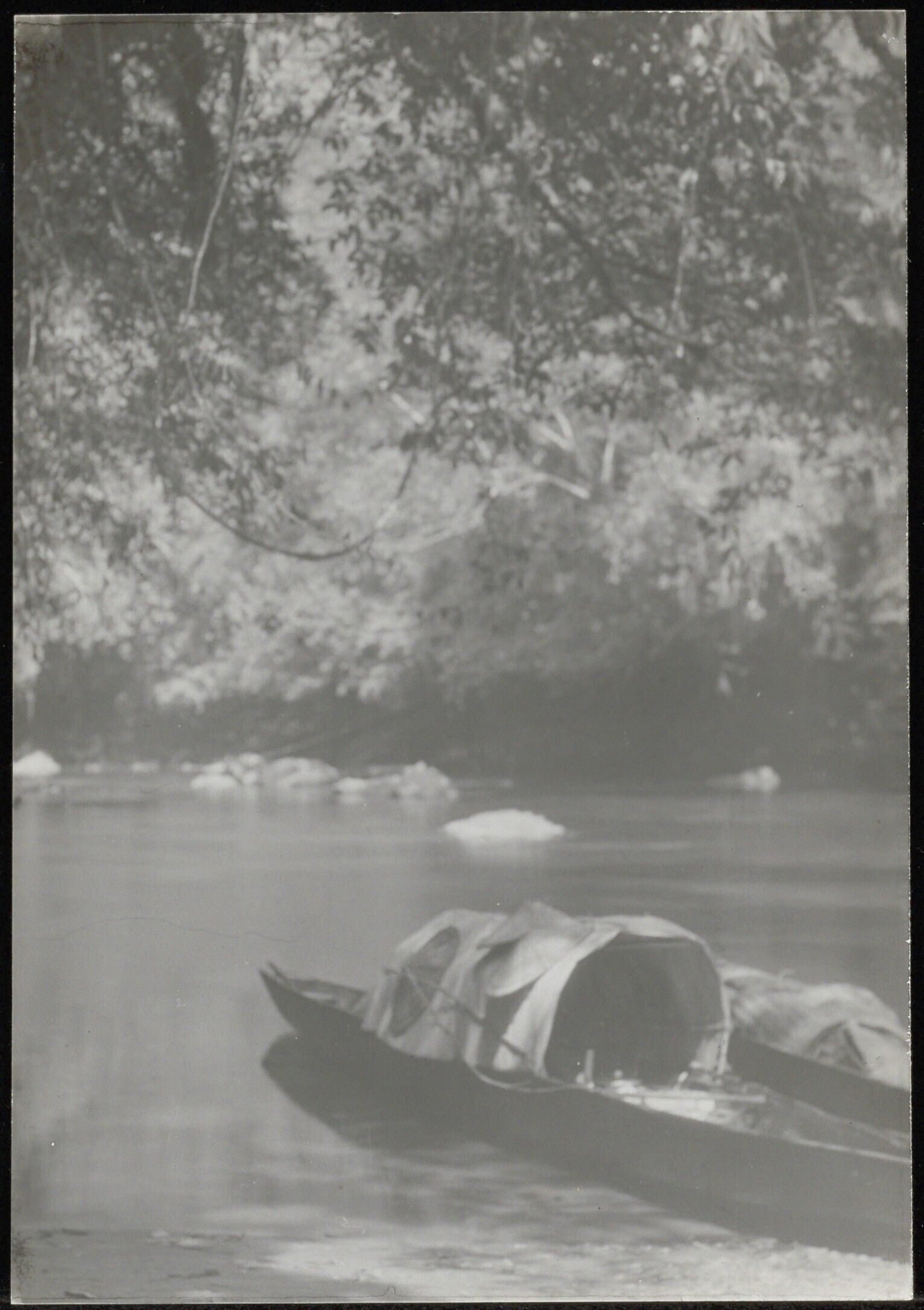 Aangemeerde prauw bij bivak van expeditie aan de riv...