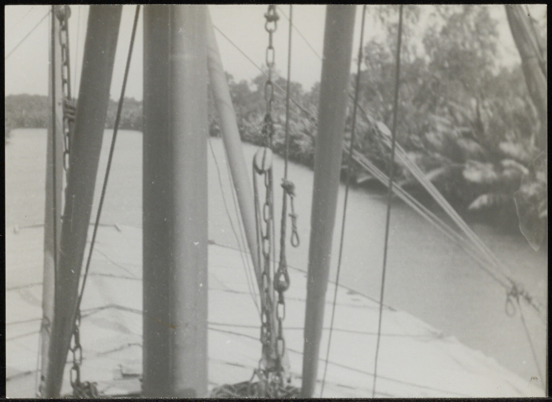 Gezicht op een rivier en een deel van een schip van ...