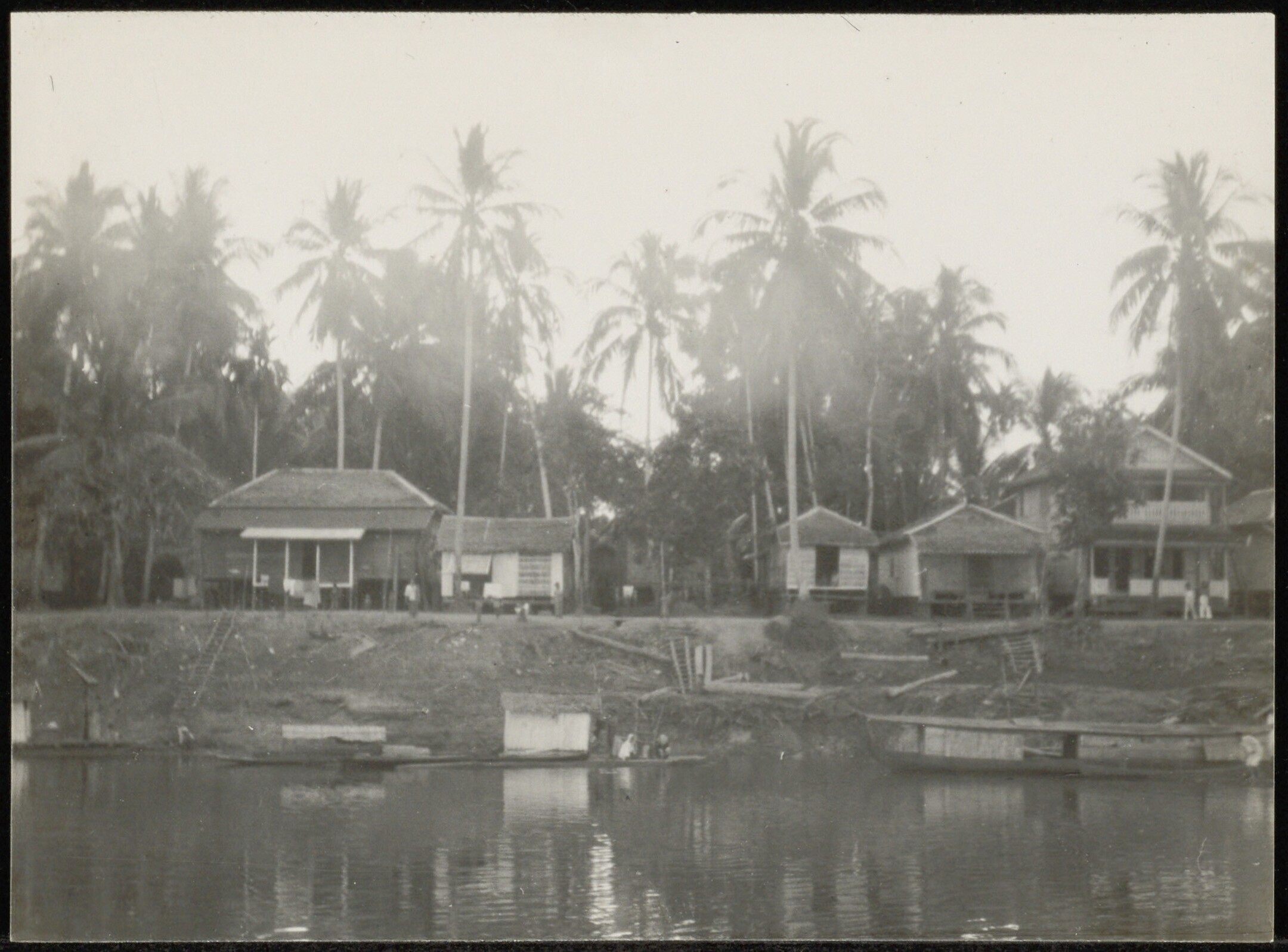 Rivier de Barito met aangemeerde prauw, gezien vanui...