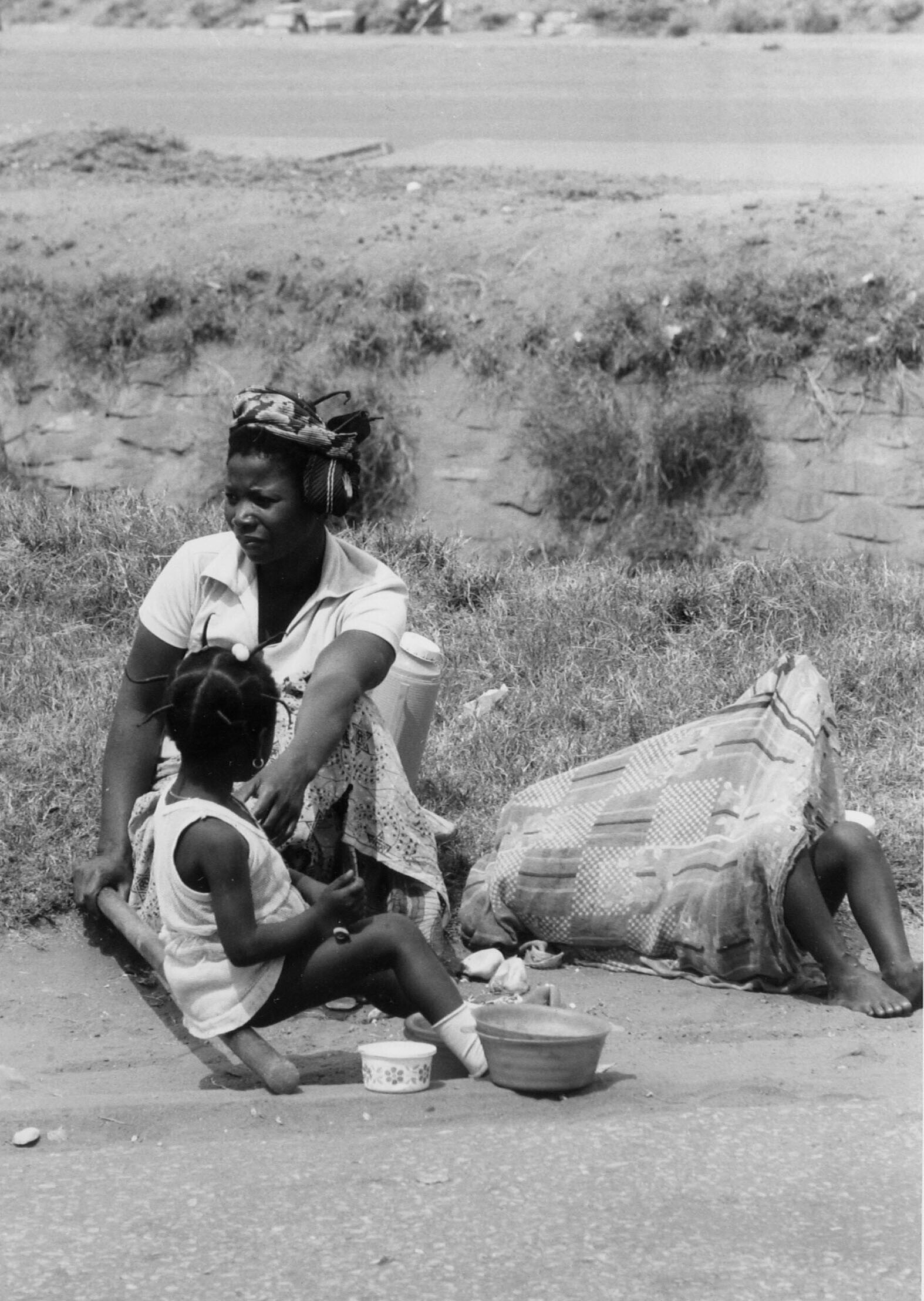 Moeder en kinderen rusten uit langs de weg