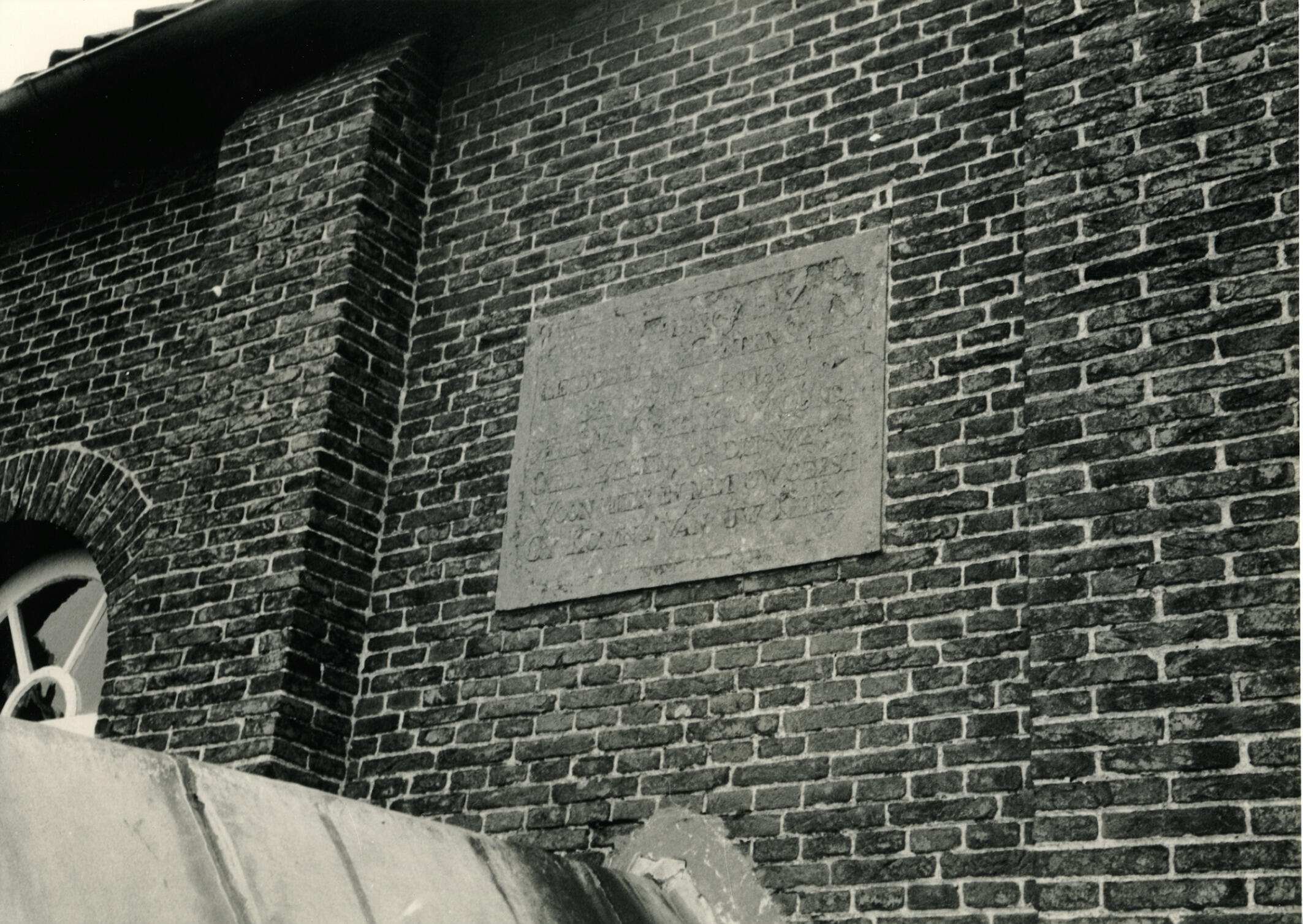 Gevelsteen van een kerk, Hellouw, 1985 (zwart-wit foto)