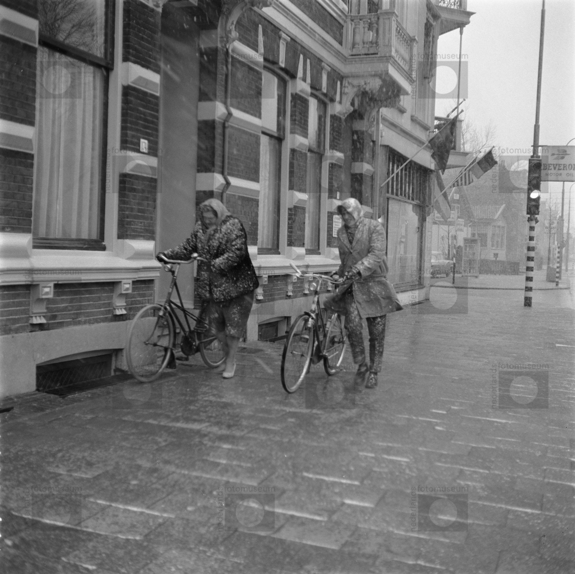 Amsterdam. Winter. Twee vrouwen lopen met de fiets a...