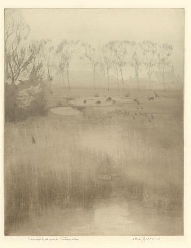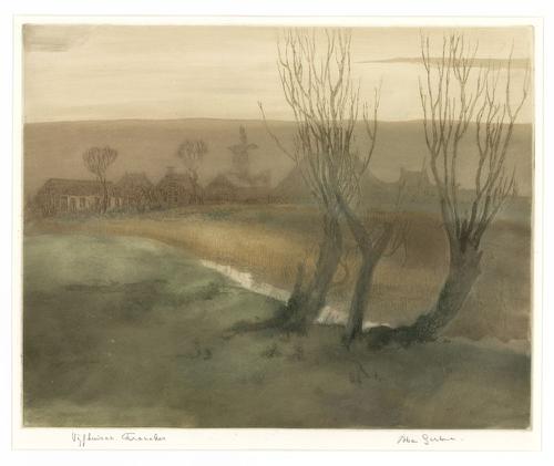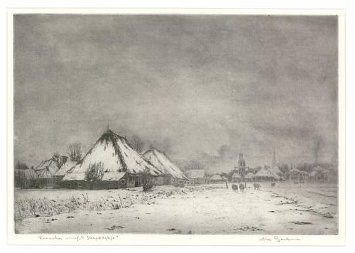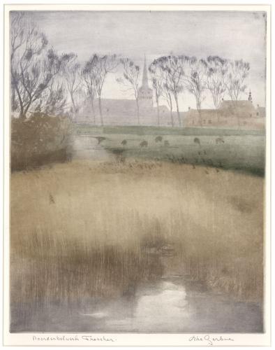 Ets in kleur van Vijfhuizen bij Franeker door Abe Ge...