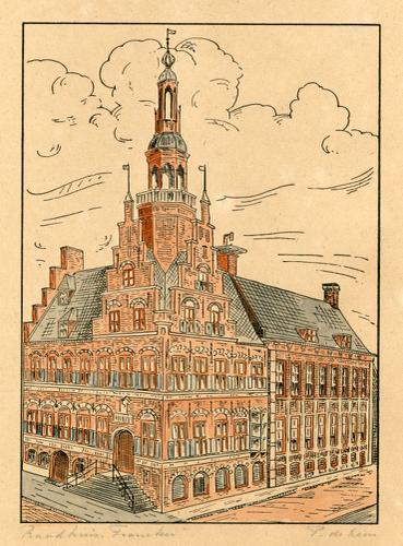 Lithografie met kleur van het Raadhuis in Franeker d...