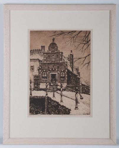Ets in kleur van een stadsgezicht in Franeker met he...