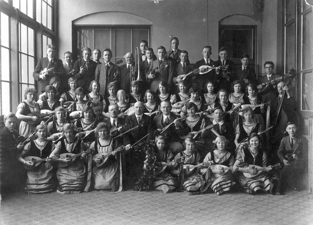 Groepsfoto van een Tiels Mandoline-orkest, circa 1926