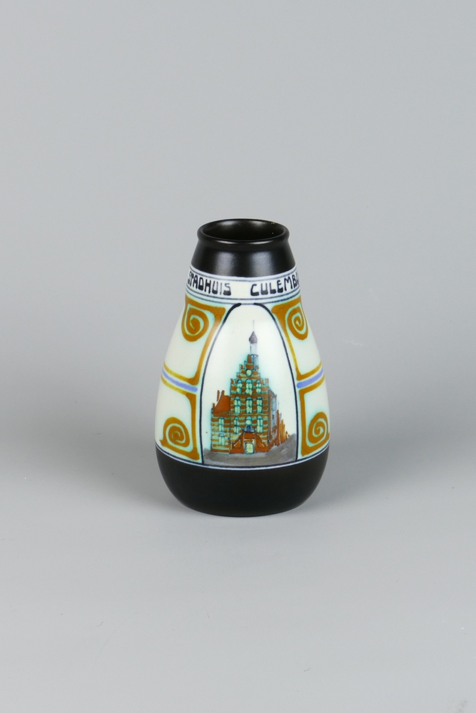 vaas van steengoed met afbeelding stadhuis te Culemb...