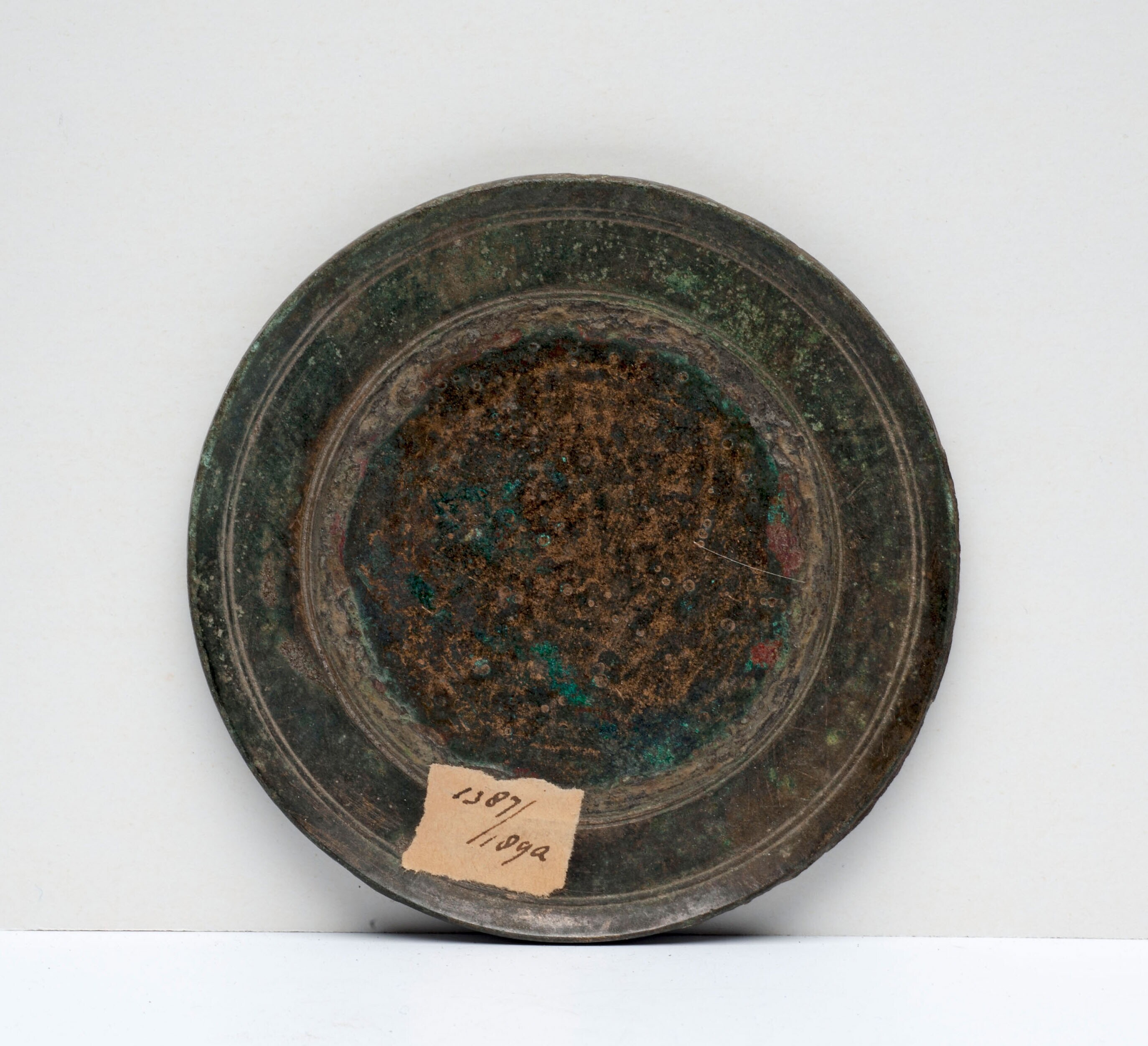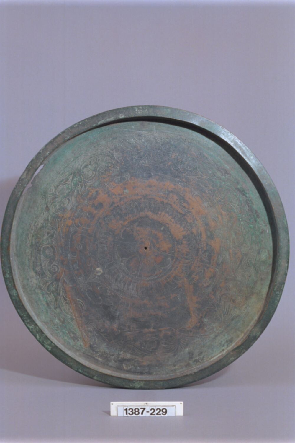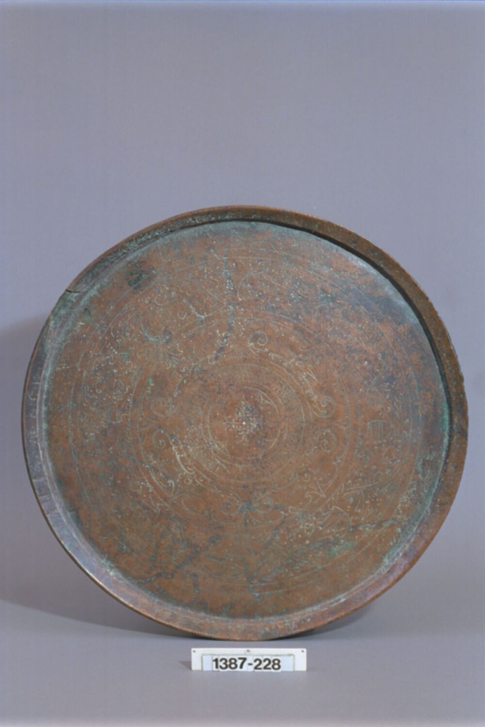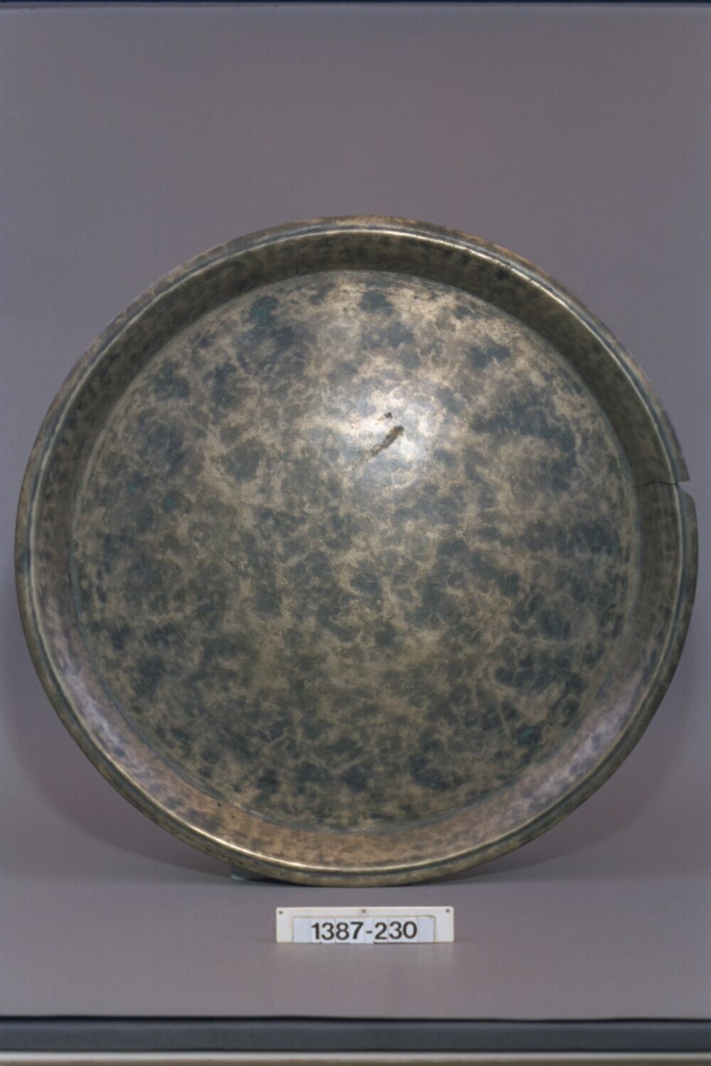 Bronzen schaal met cirkelvormige versieringen op de ...