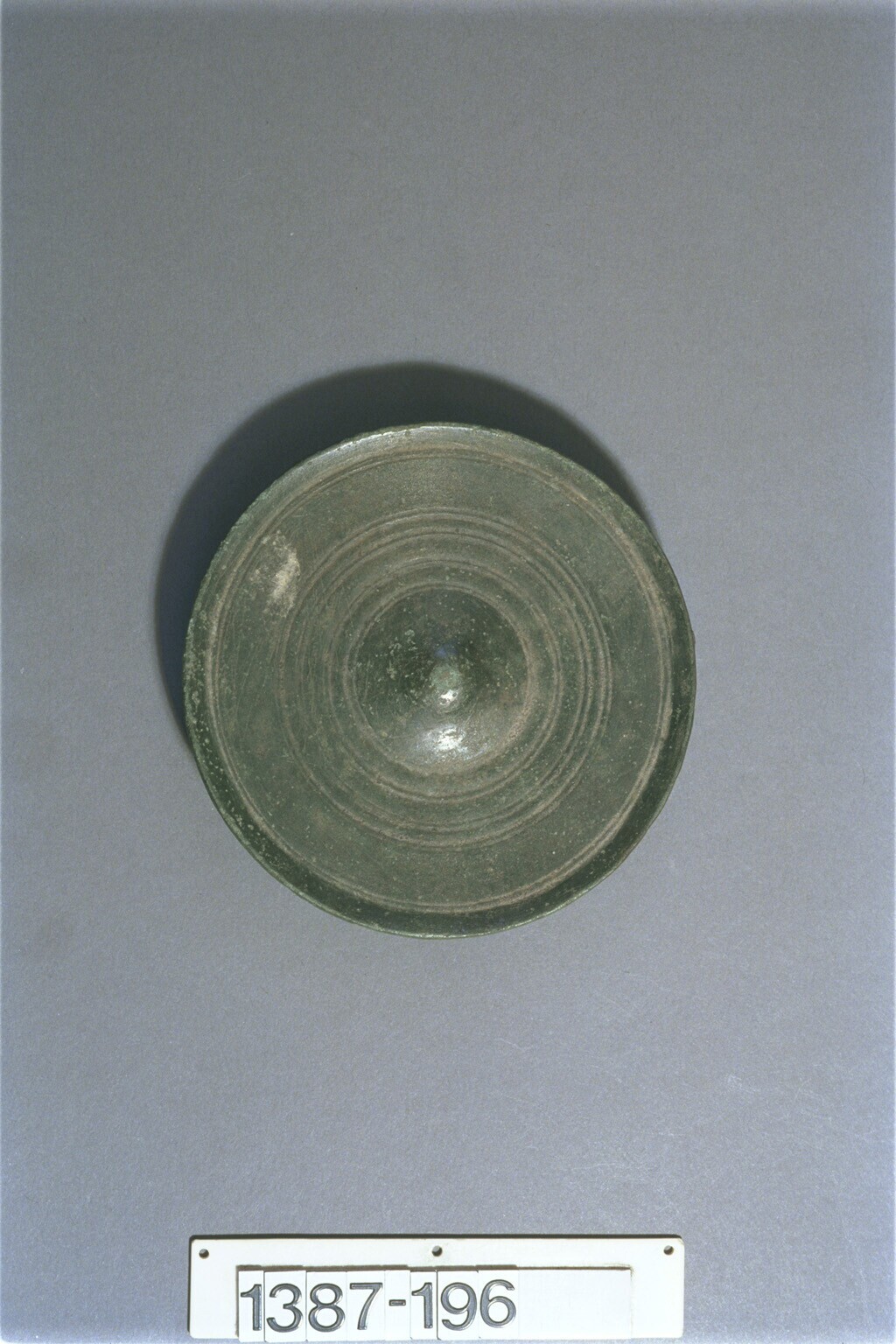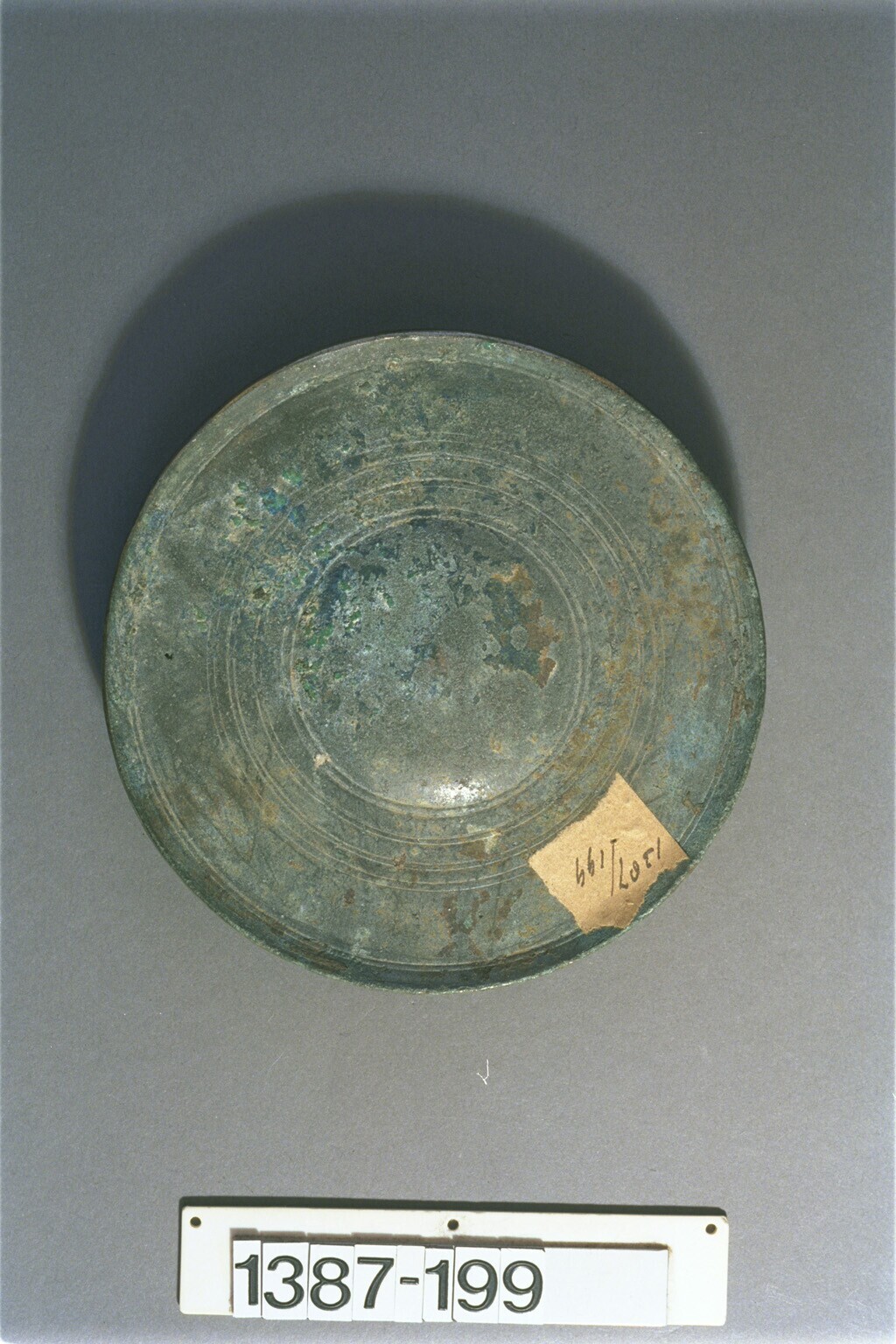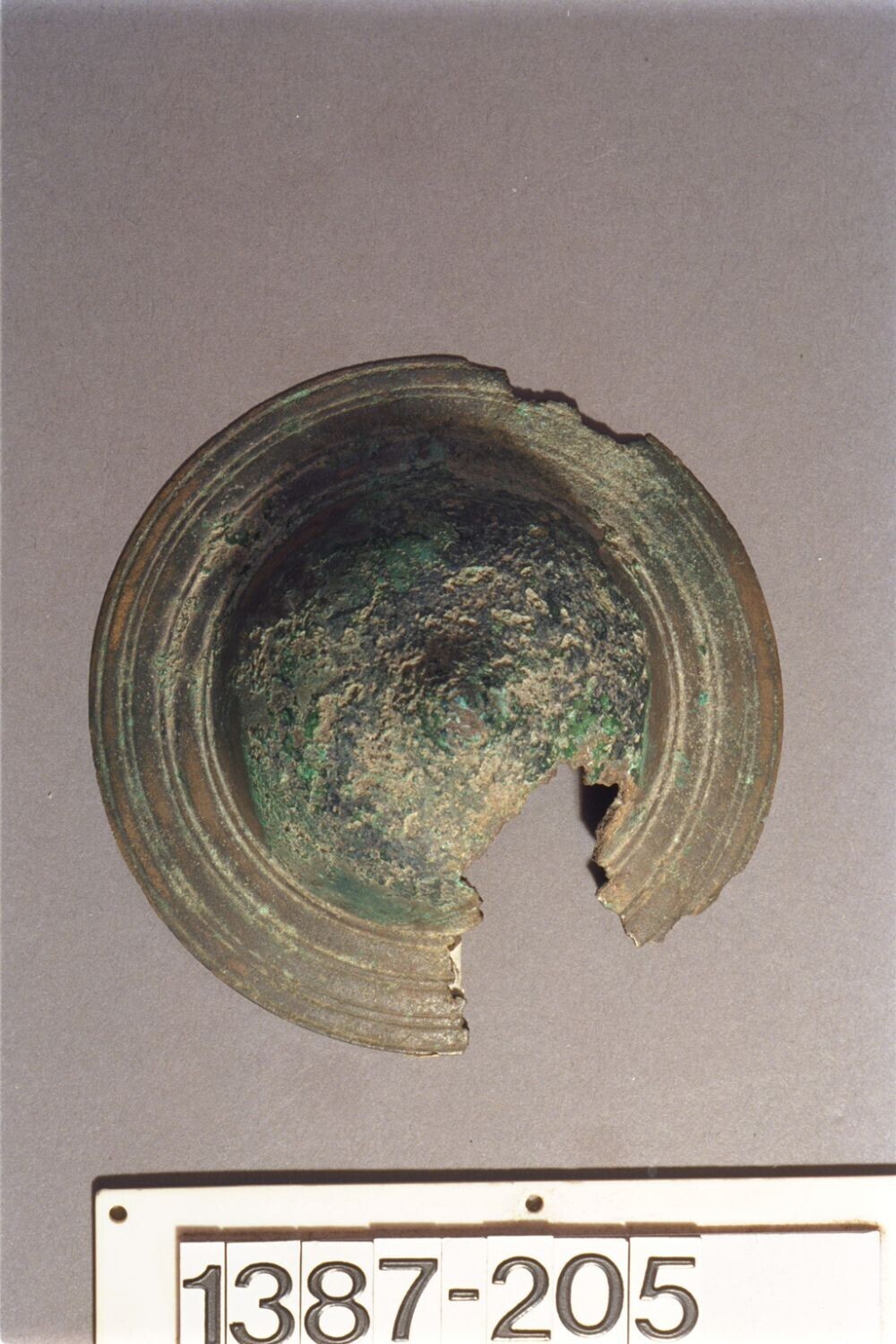 Bronzen schaal met cirkelvormige versieringen op de ...