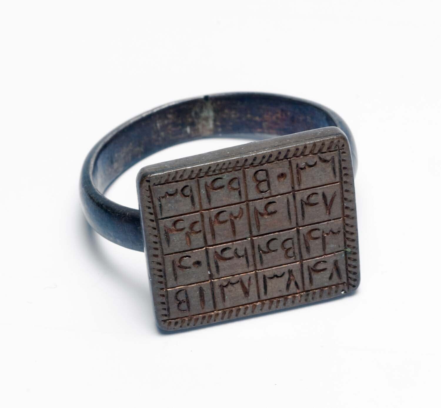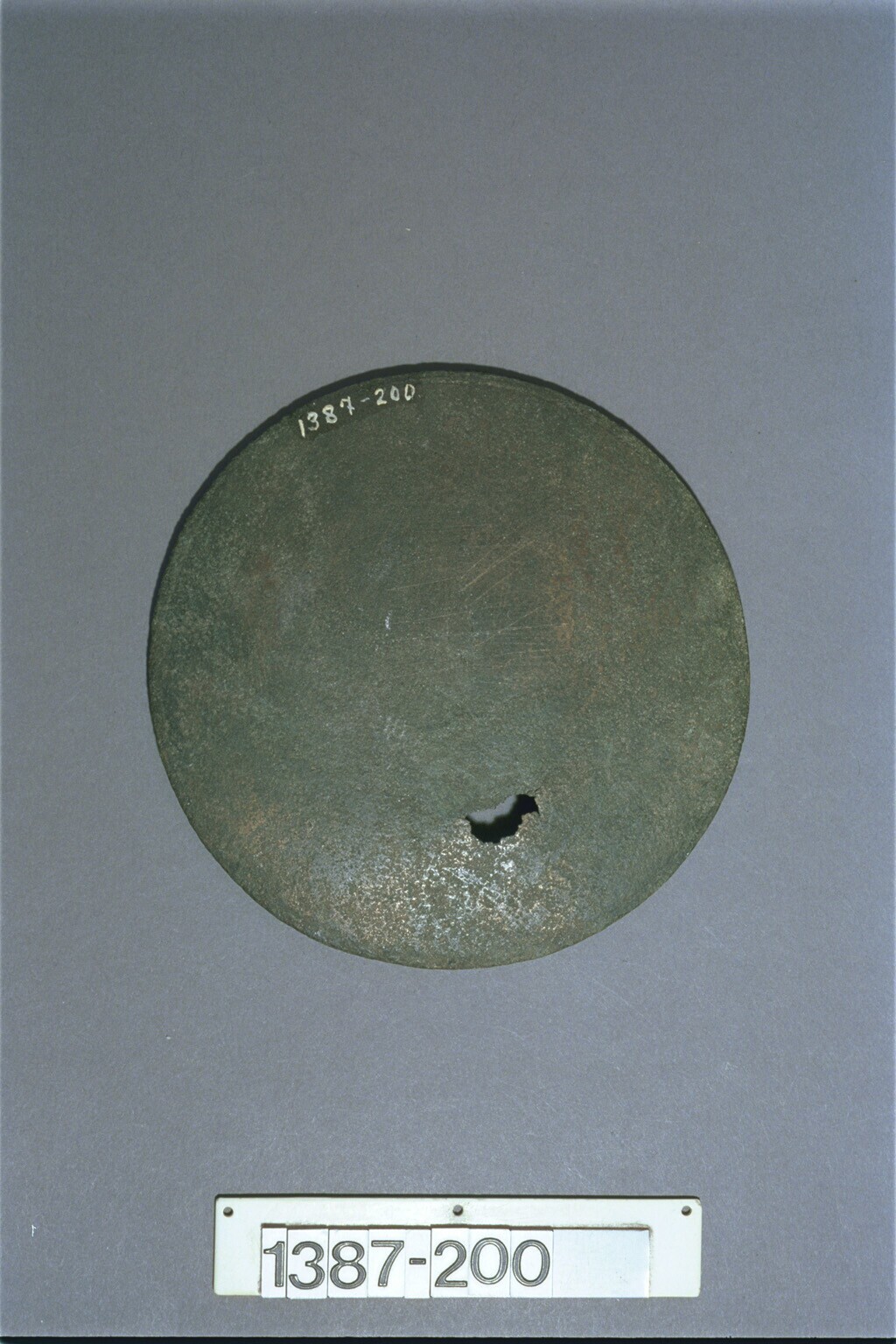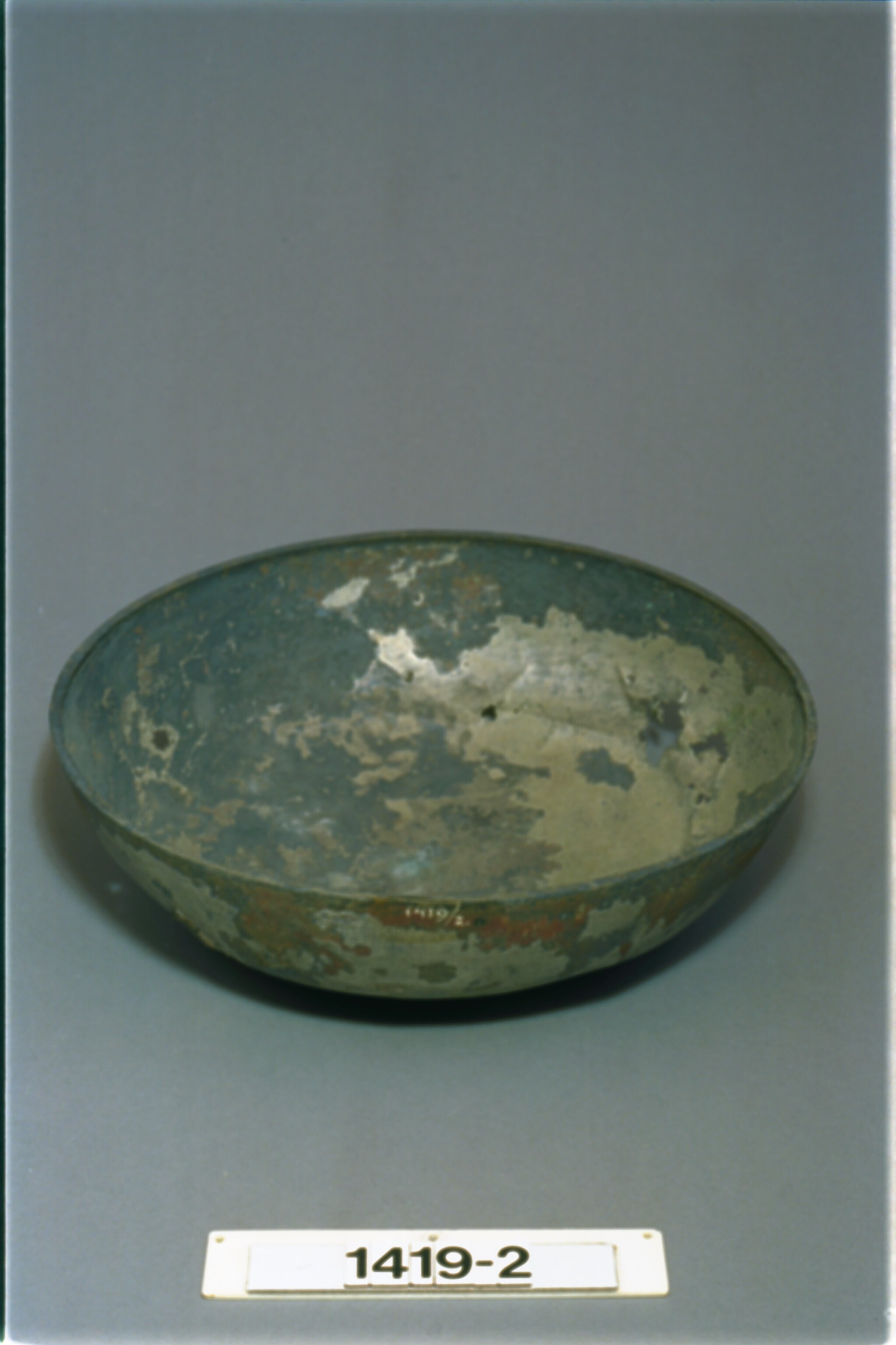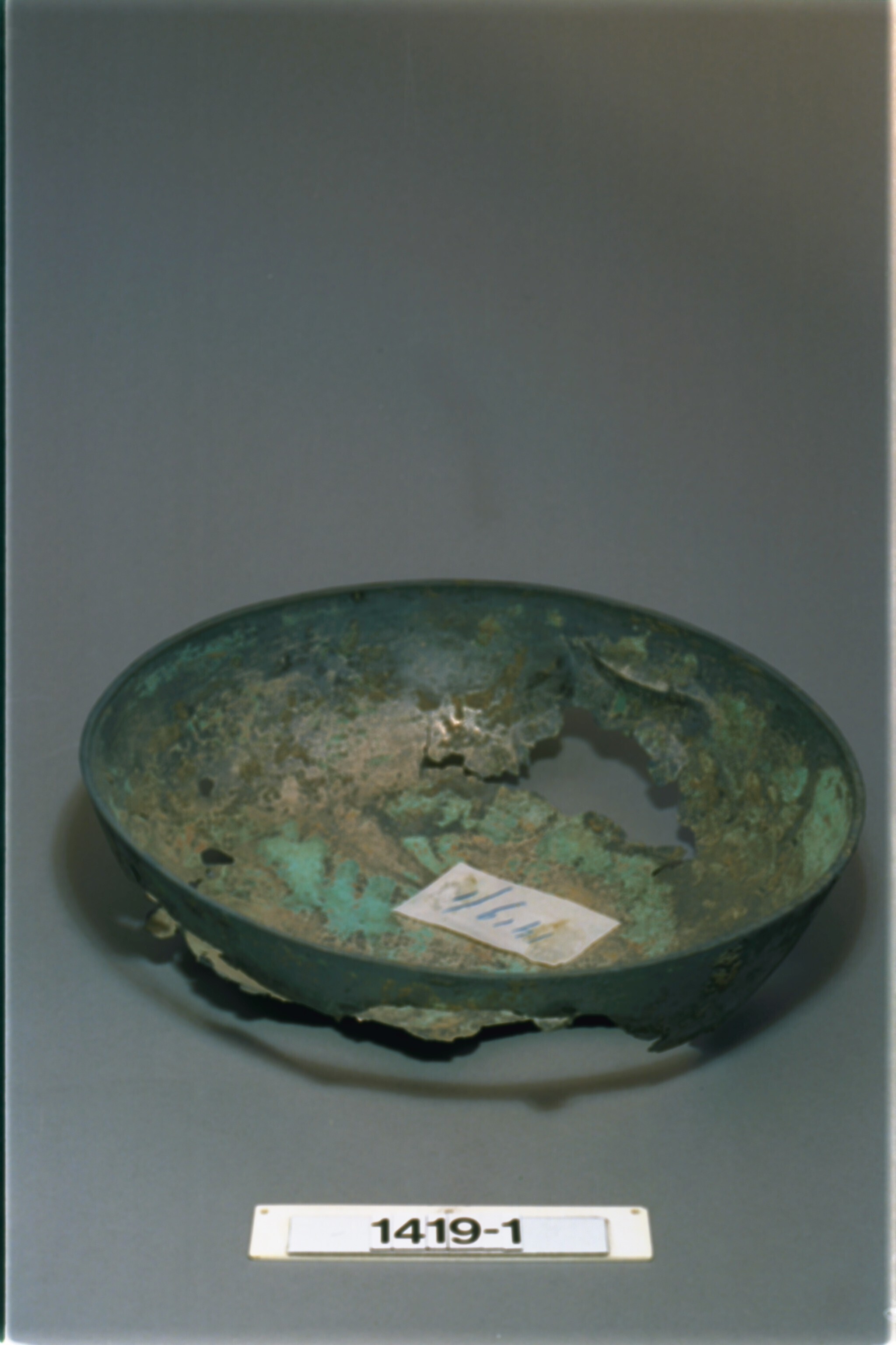 Bronzen schaal met cirkelvormige versieringen op de ...