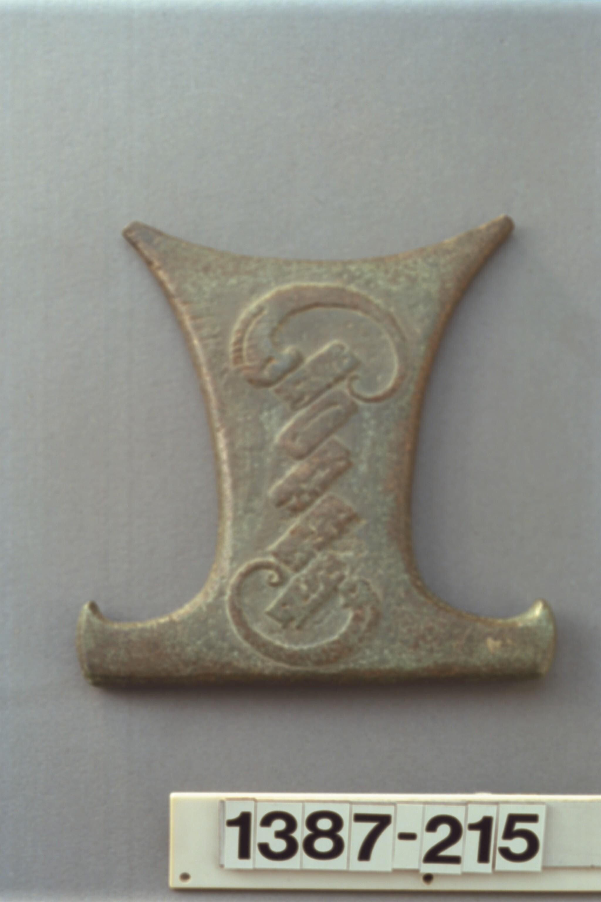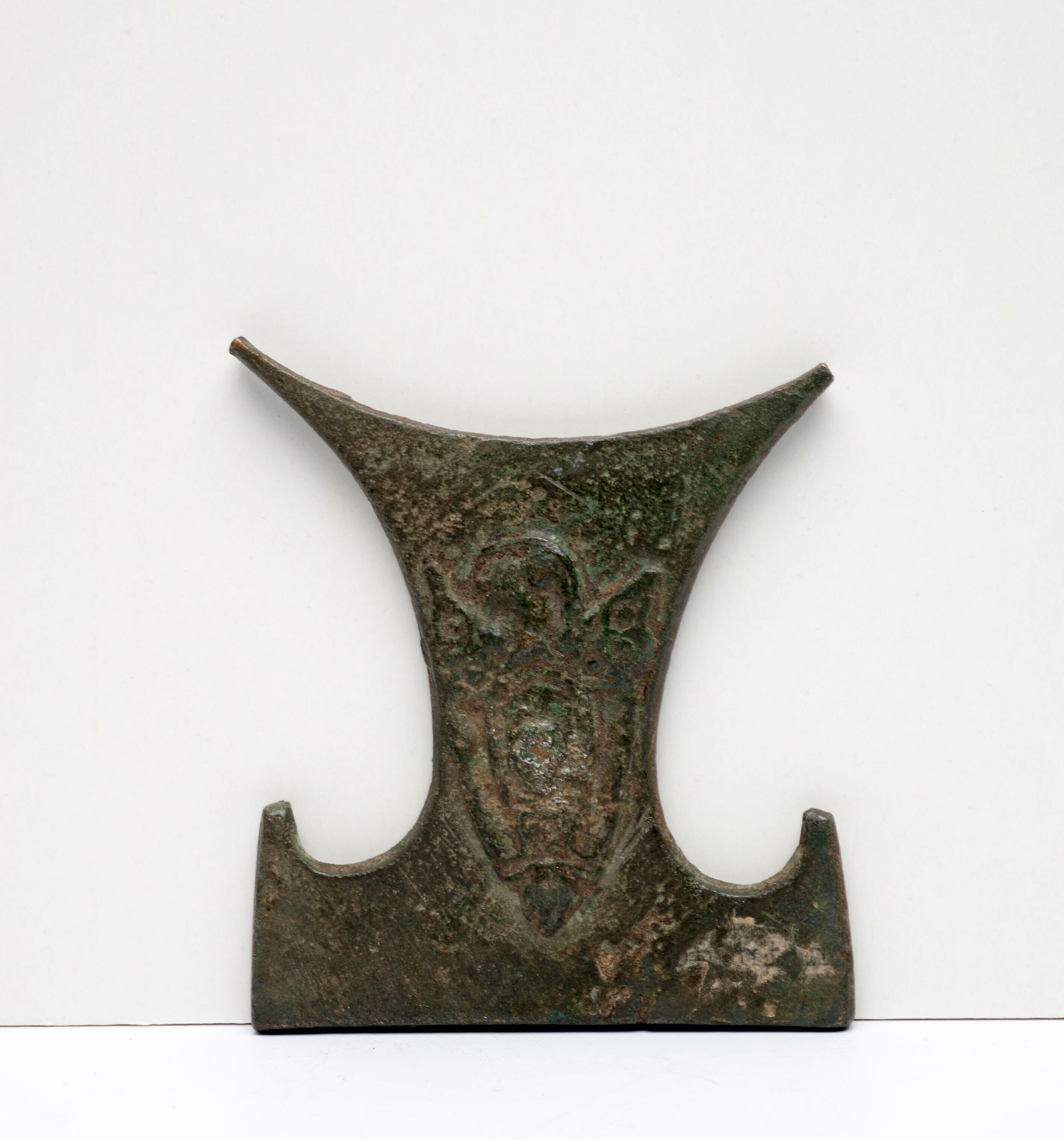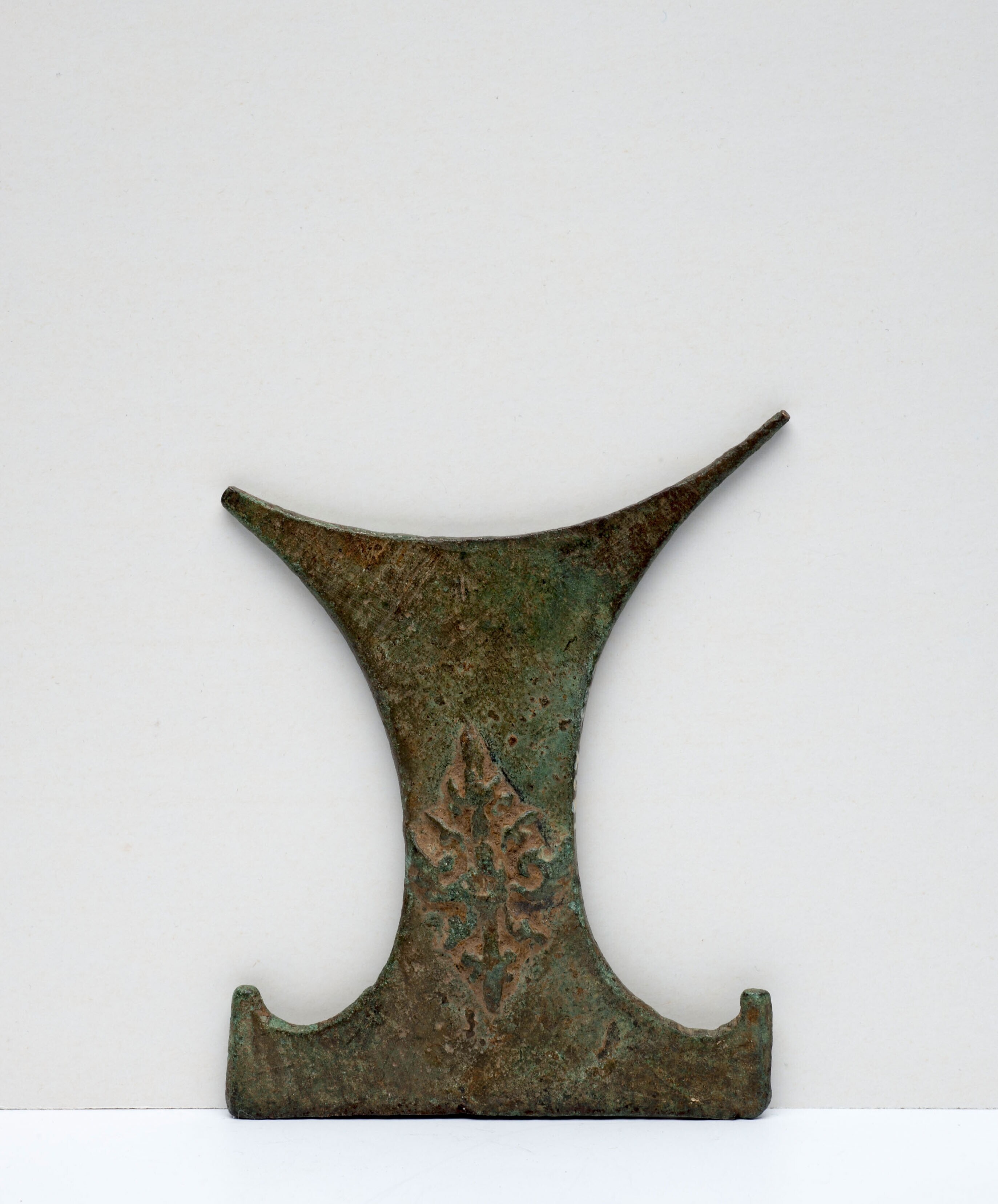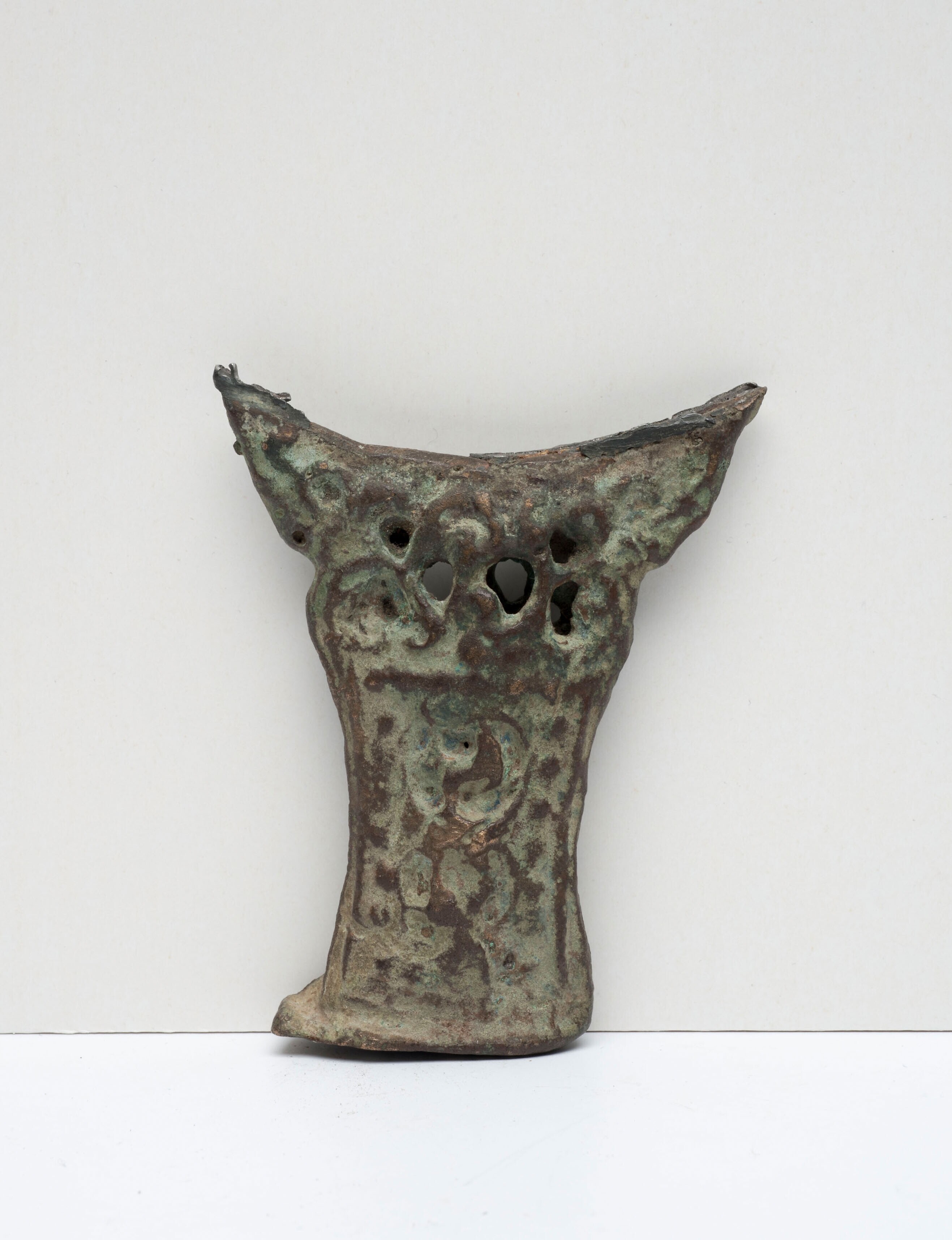 Bronzen spiegelhandvat met een versiering in de vorm...