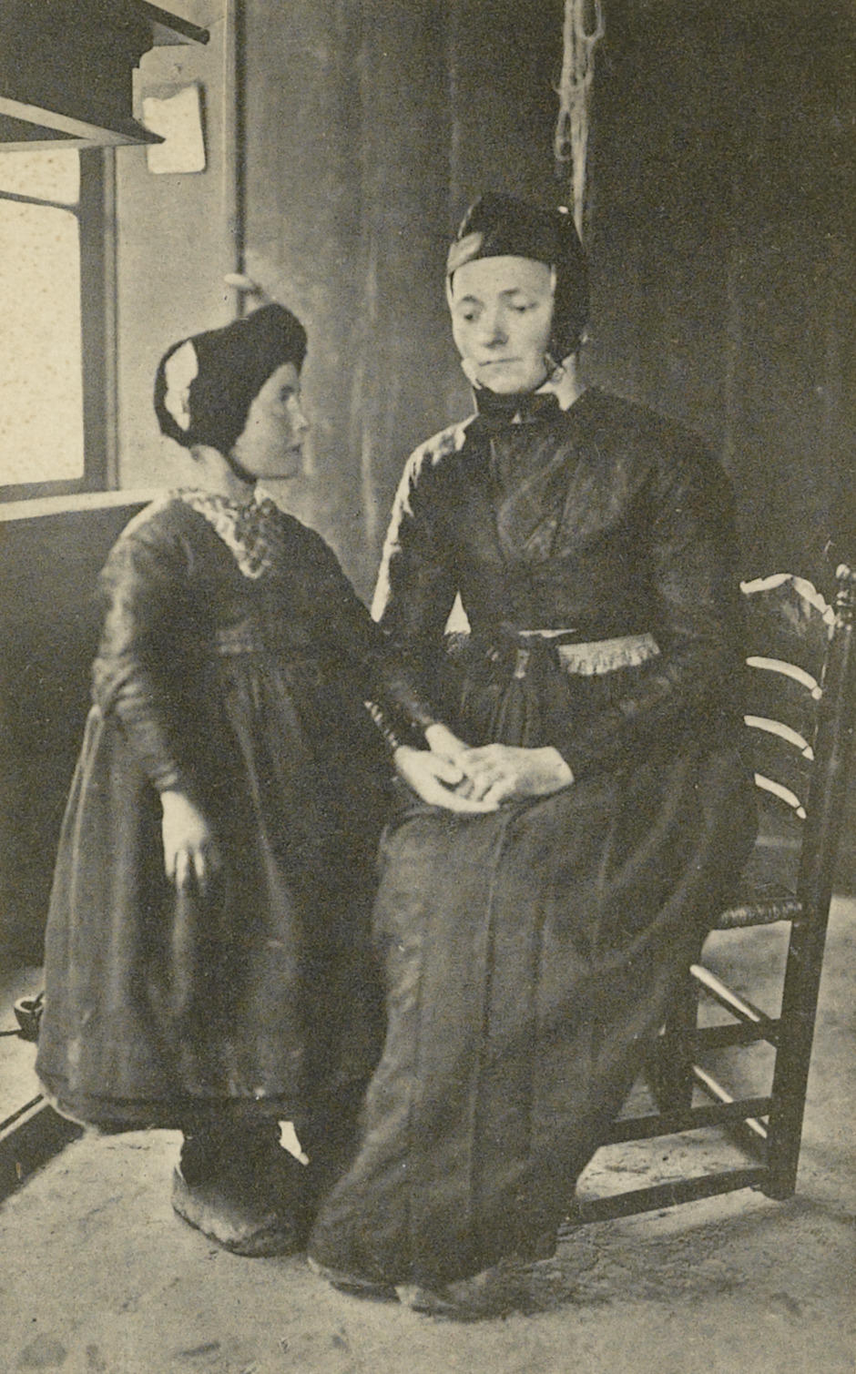 Twee vrouwen in zondagse kerkdracht voor de winter, ...