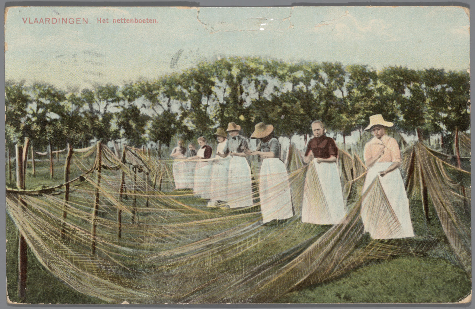 Vrouwen in Vlaardingse streekdracht aan het netten b...