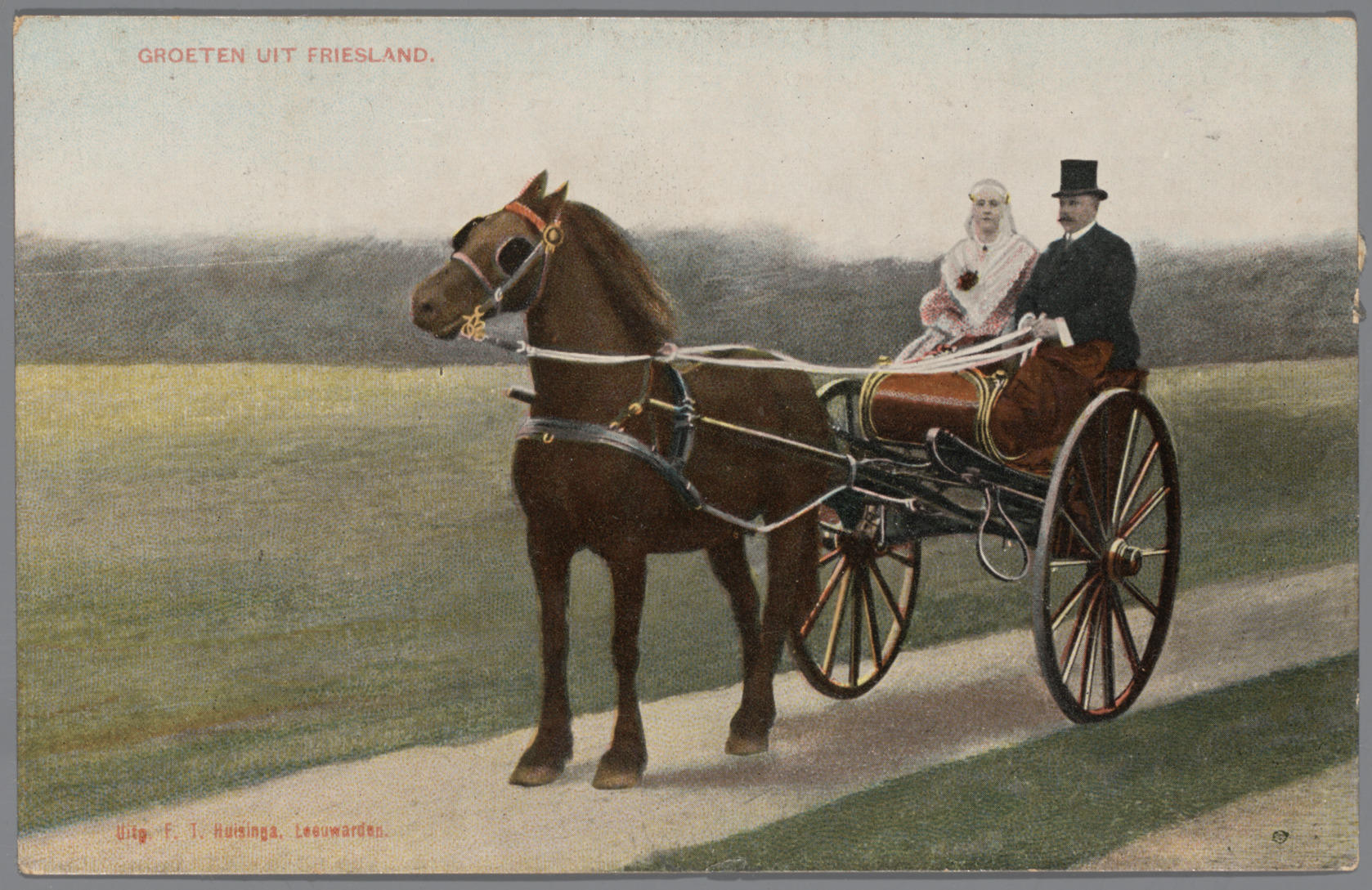 Echtpaar in Friese streekdracht in sjees (ansichtkaart)