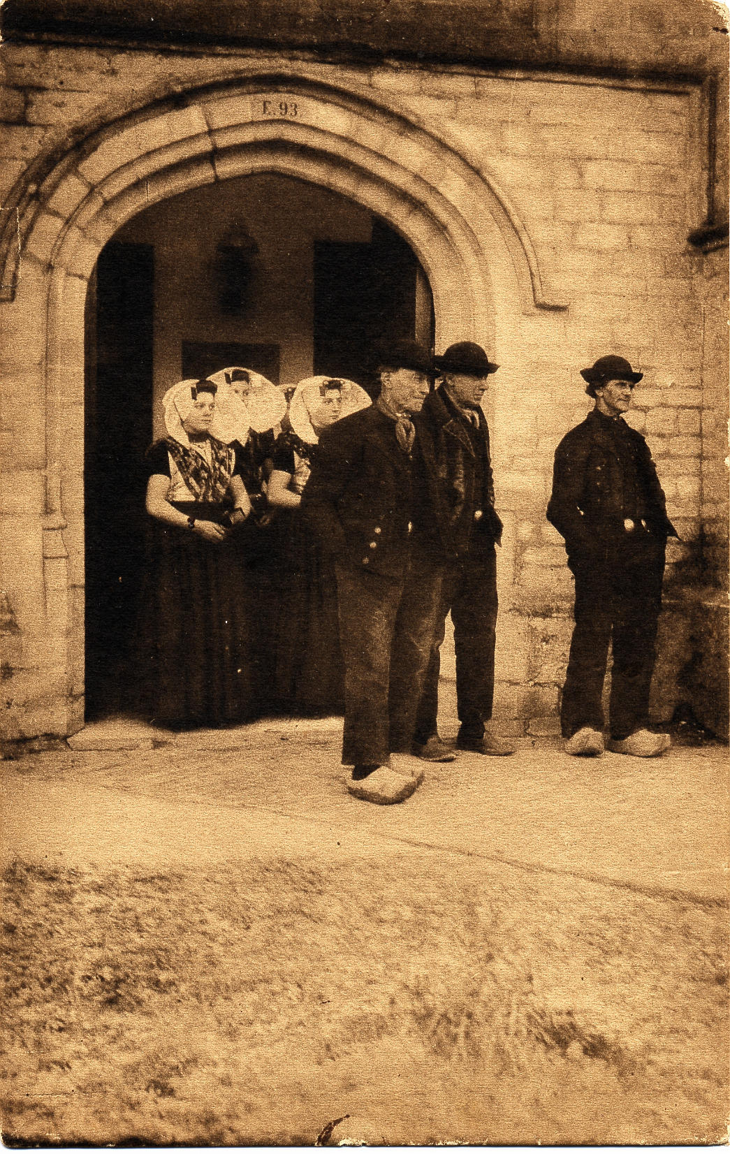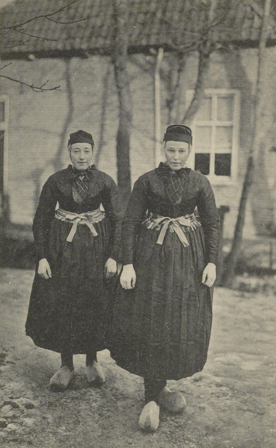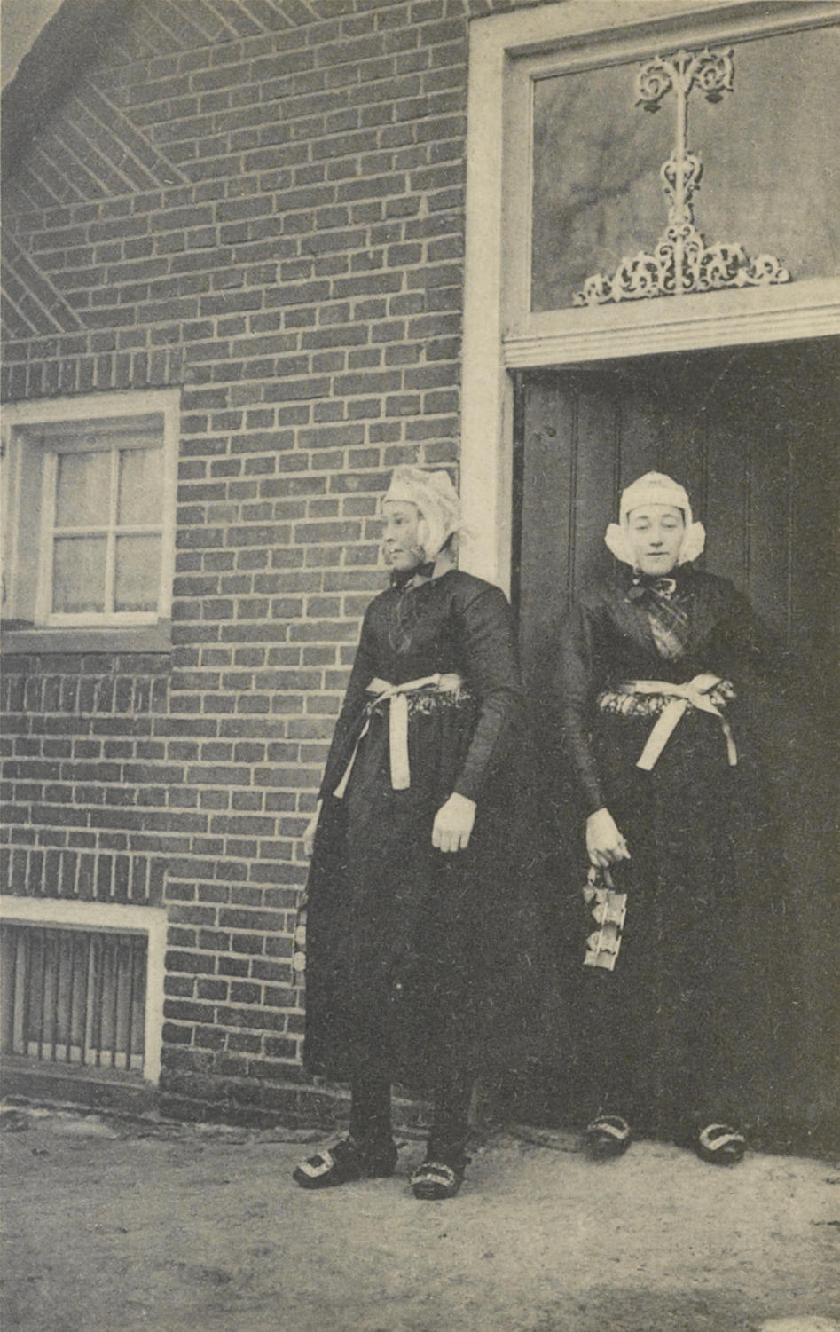 Twee vrouwen in zondagse kerkdracht voor de winter, ...