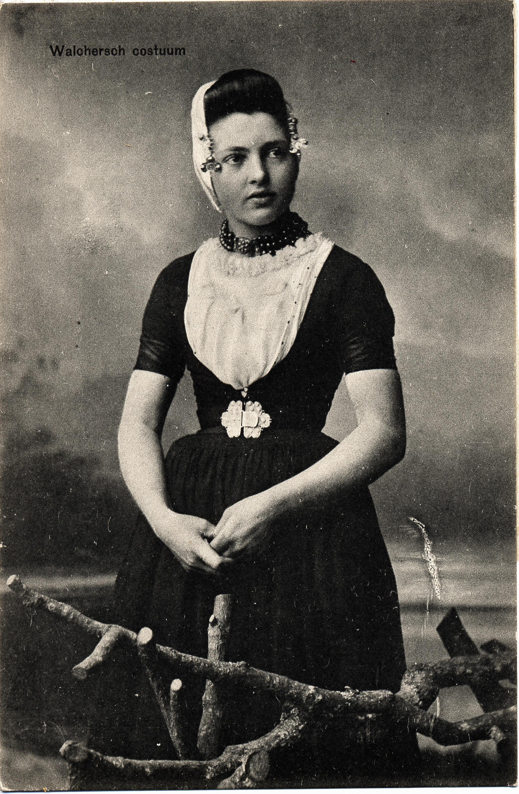 Vrouw in Sallandse streekdracht, 1943 (zwart-wit foto)