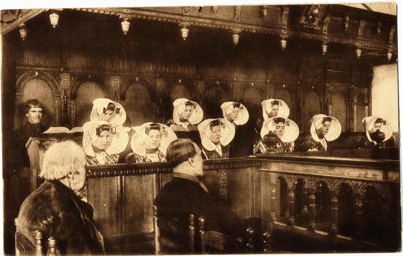 Kerkinterieur met mannen en vrouwen in protestantse ...