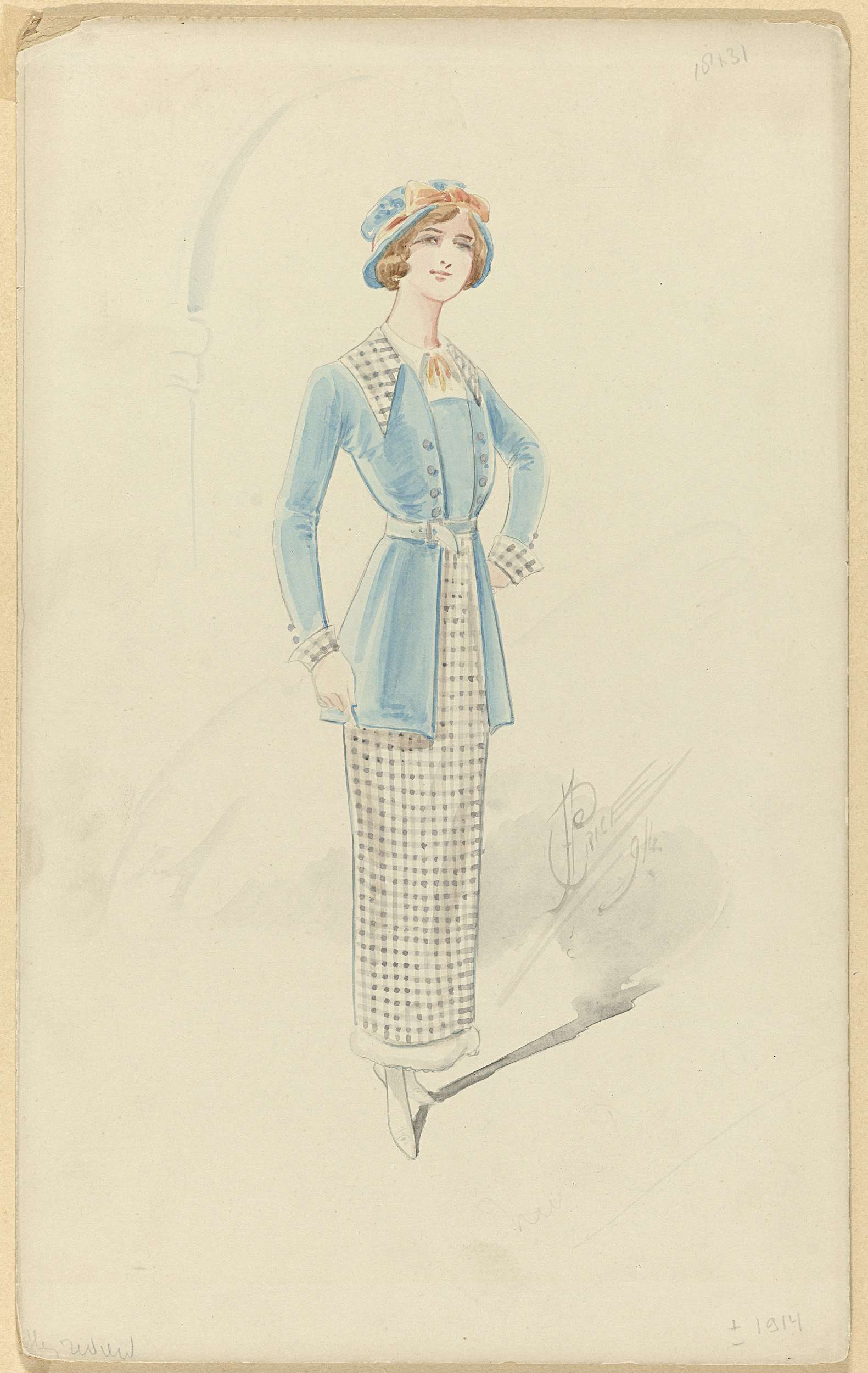 Jonge vrouw in zwart-wit geblokt ensemble, 1914