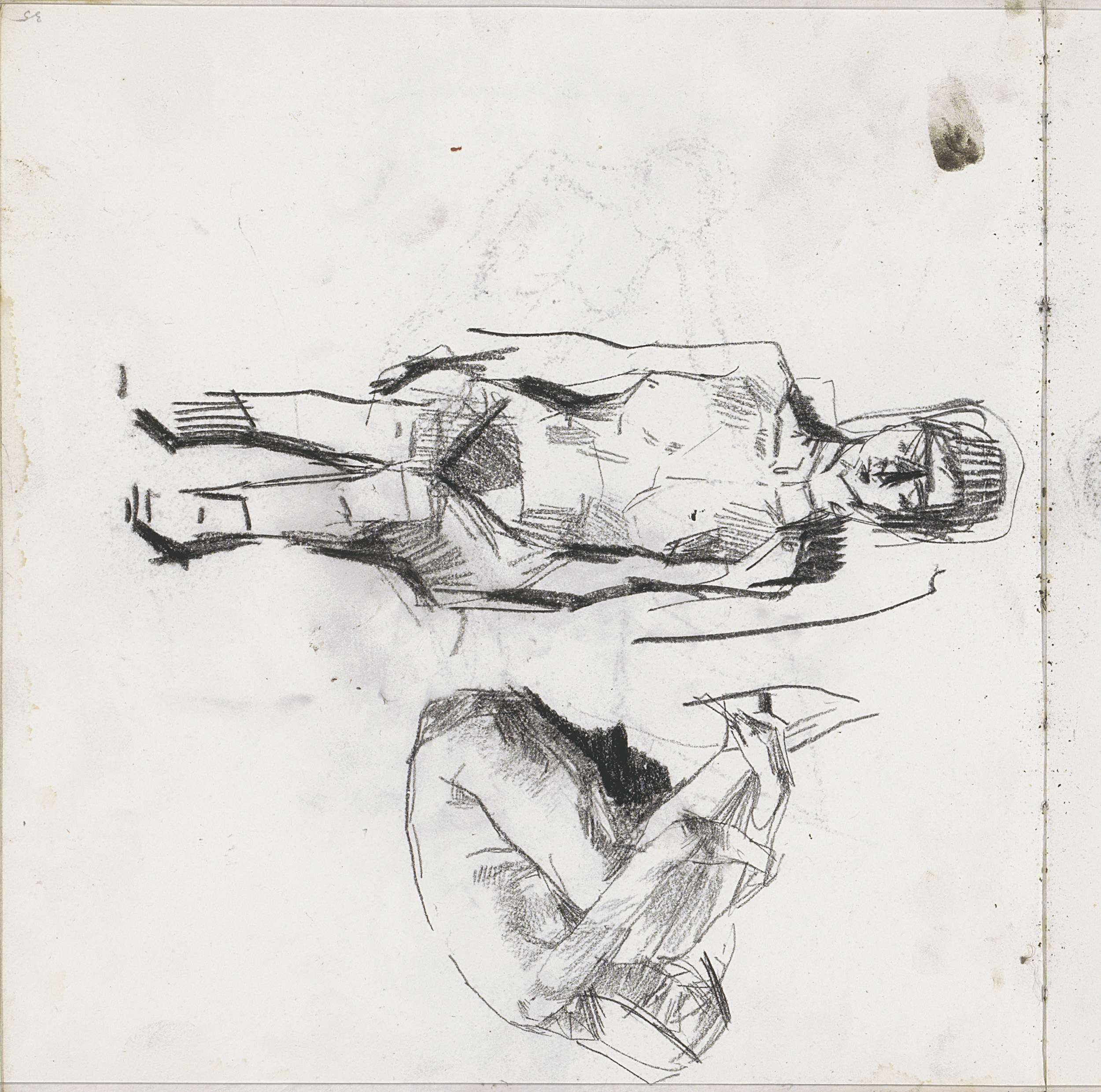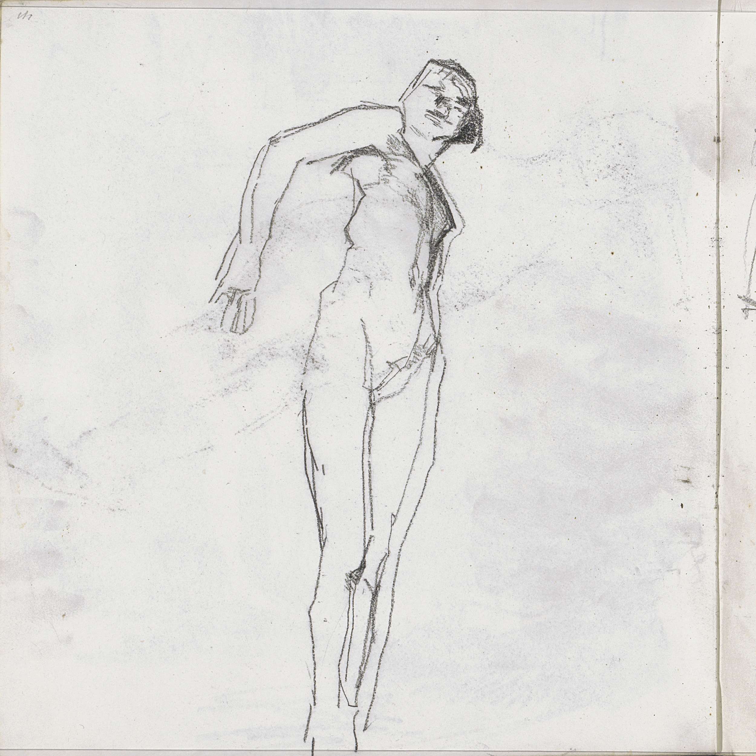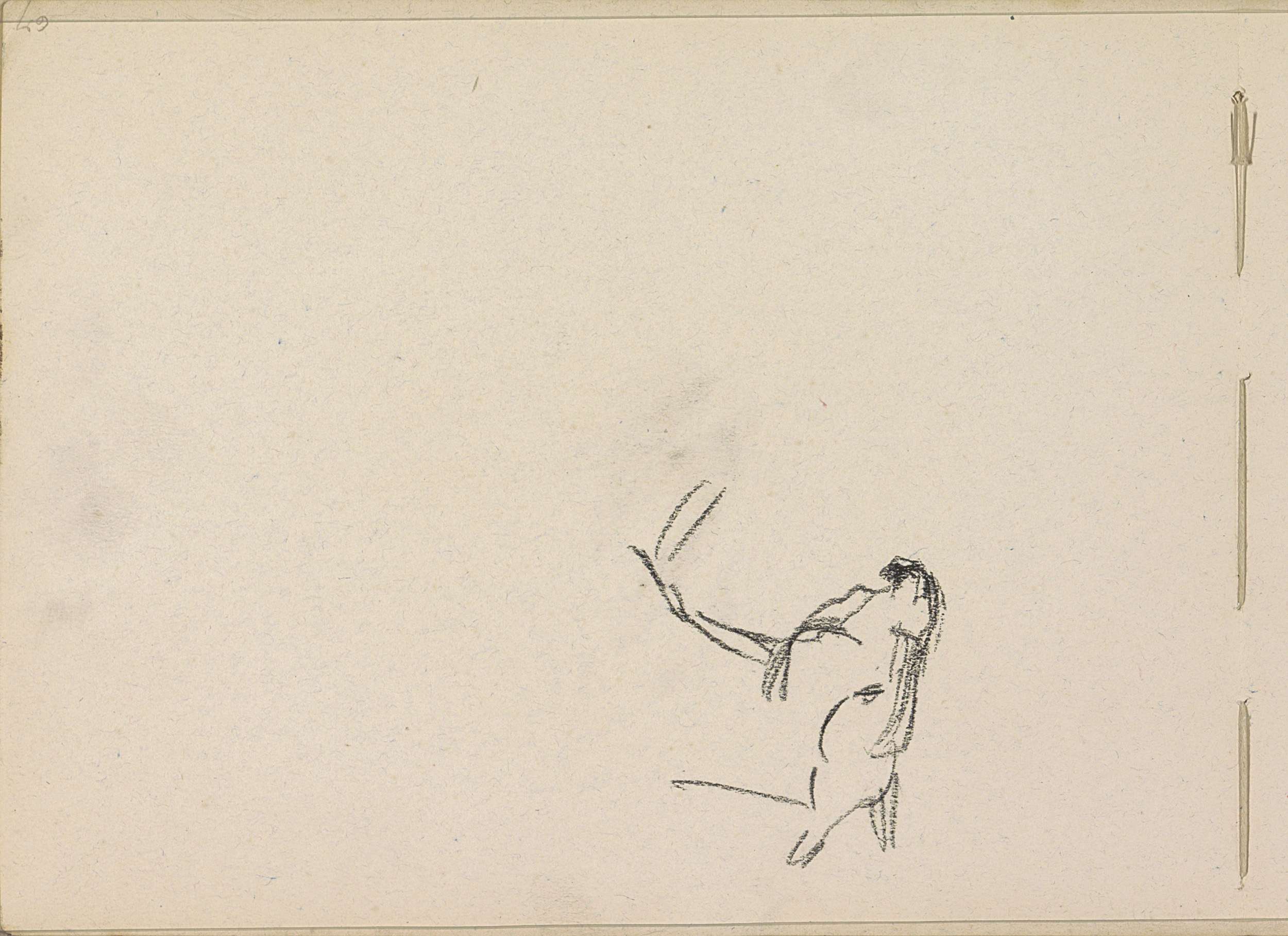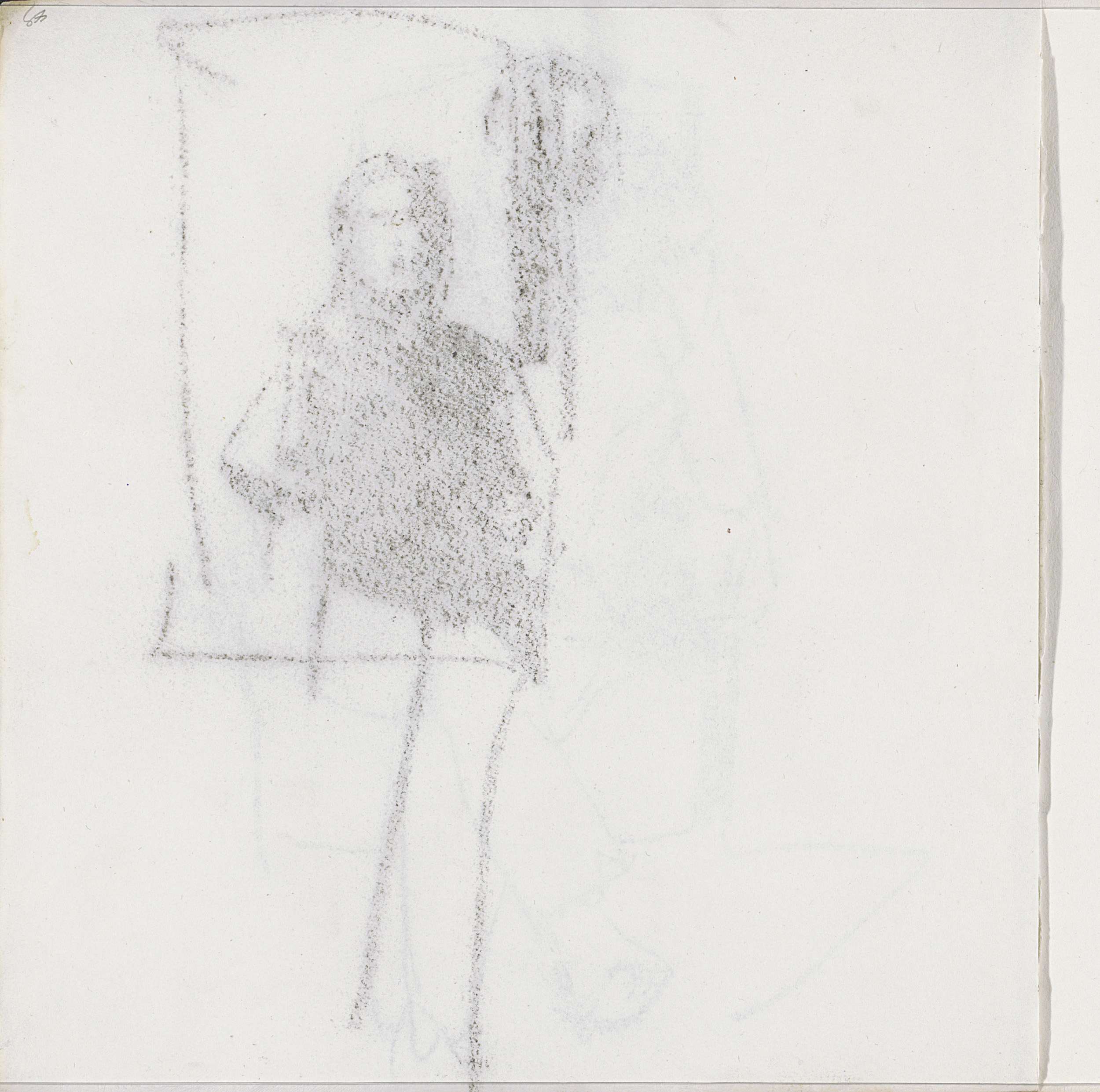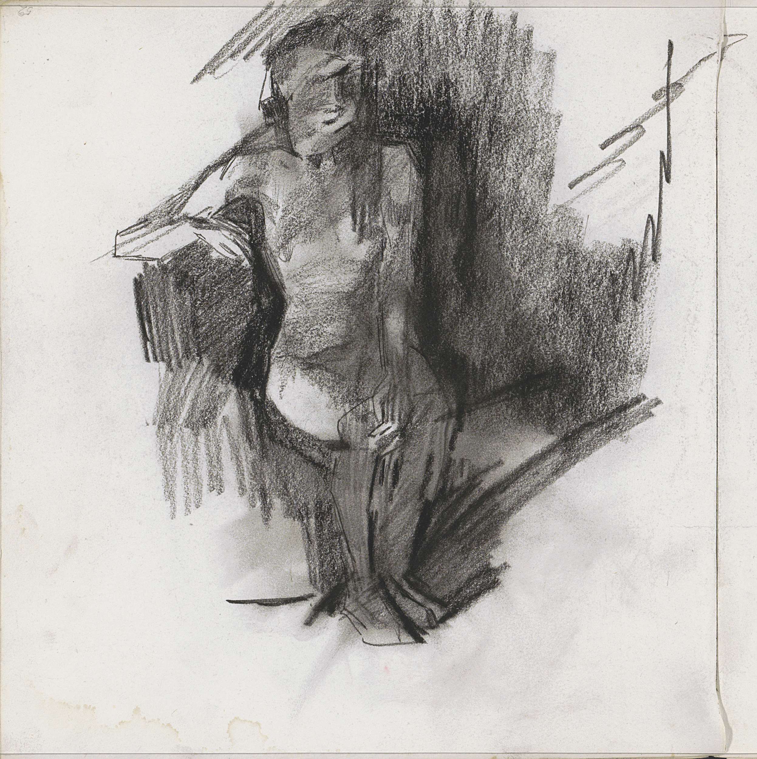 Staand vrouwelijk naakt, leunend op een fauteuil