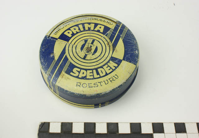 Ronde gele bus met bruine deksel en op de zijde een ...