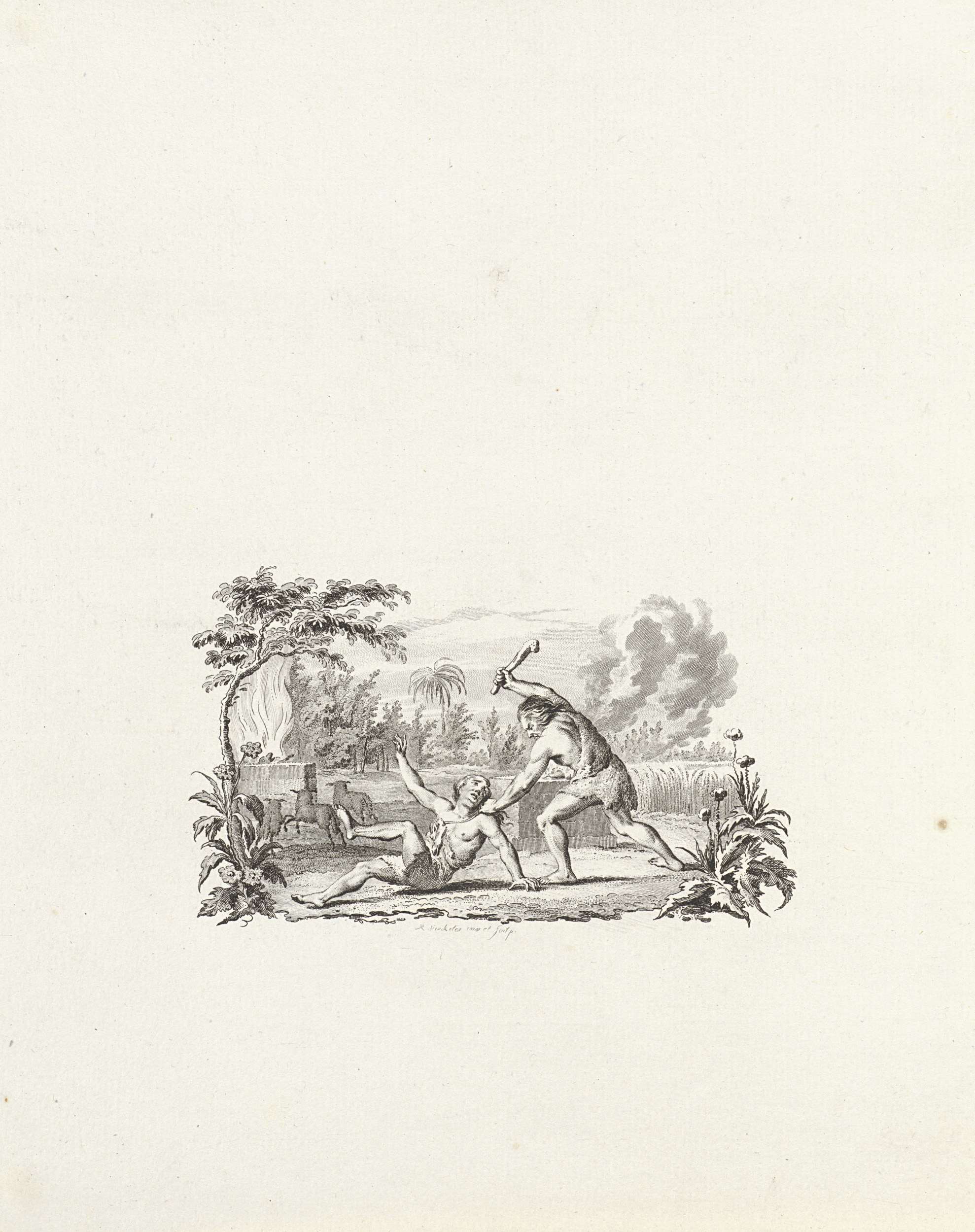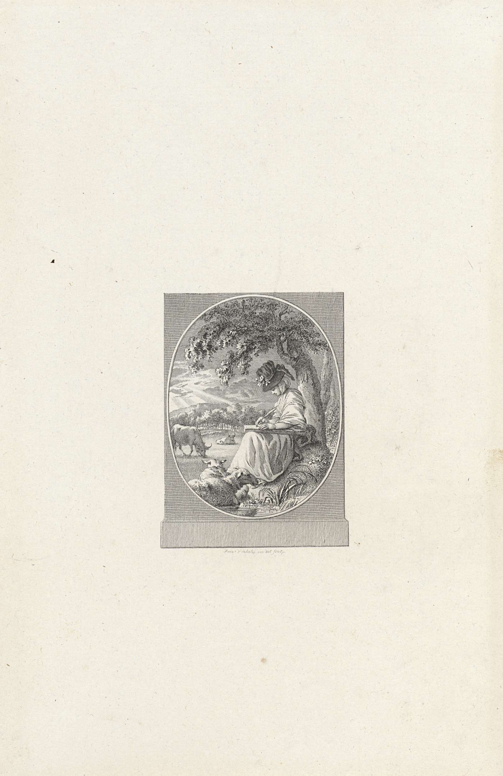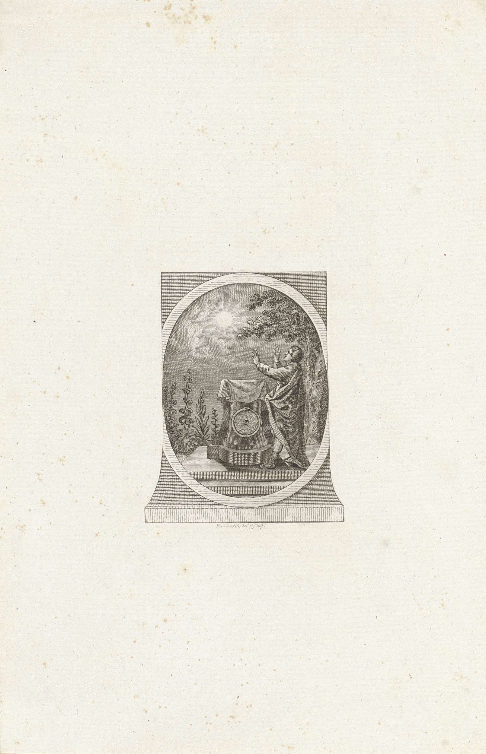 Vignet met een landschap met een monument waarop boe...