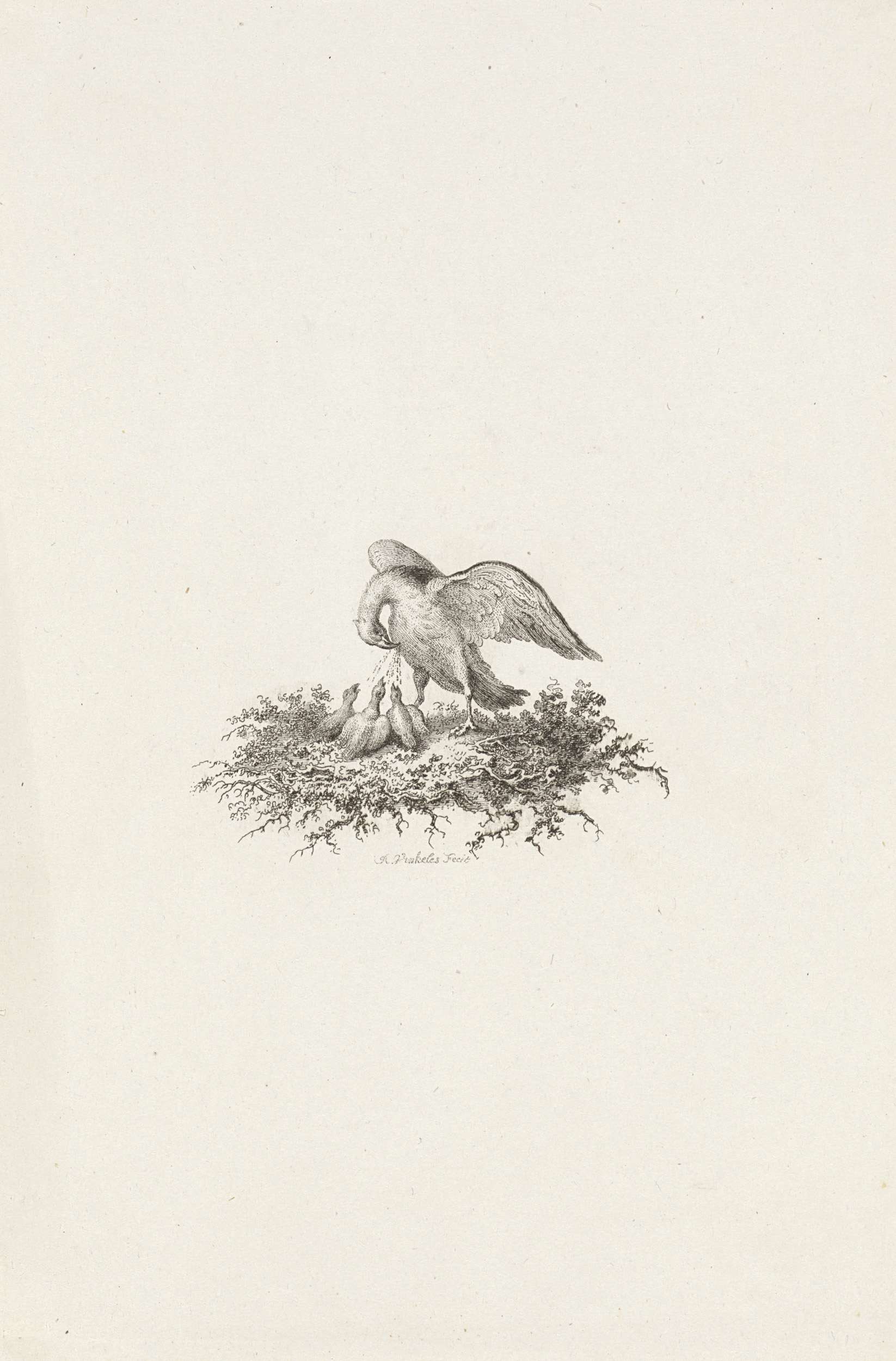 Vignet met een pelikaan die zich in de borst pikt
