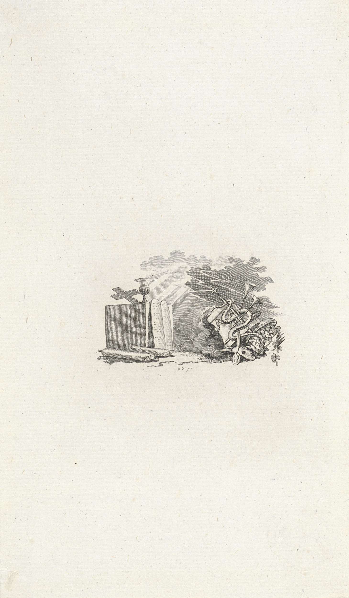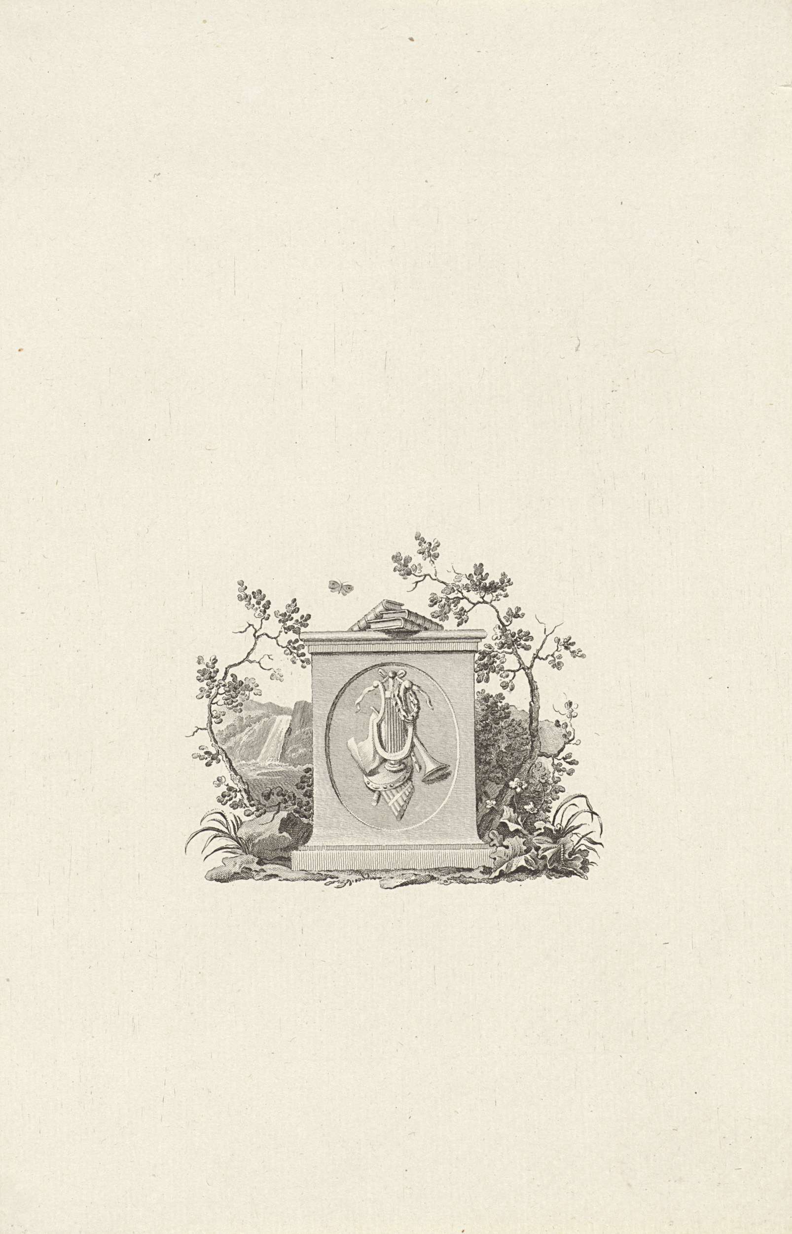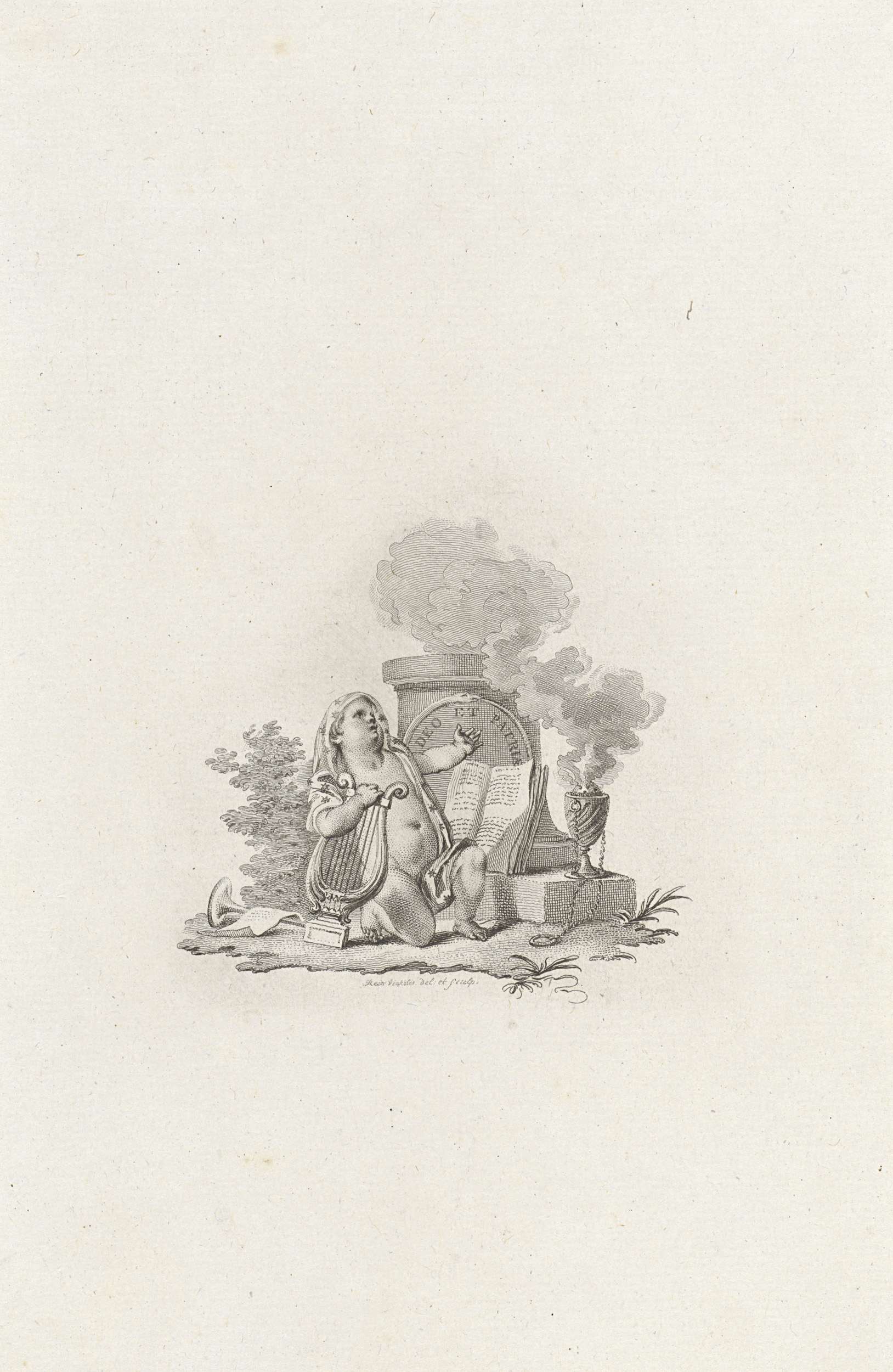 Vignet met een harp, bijbel en evangelie op een voet...