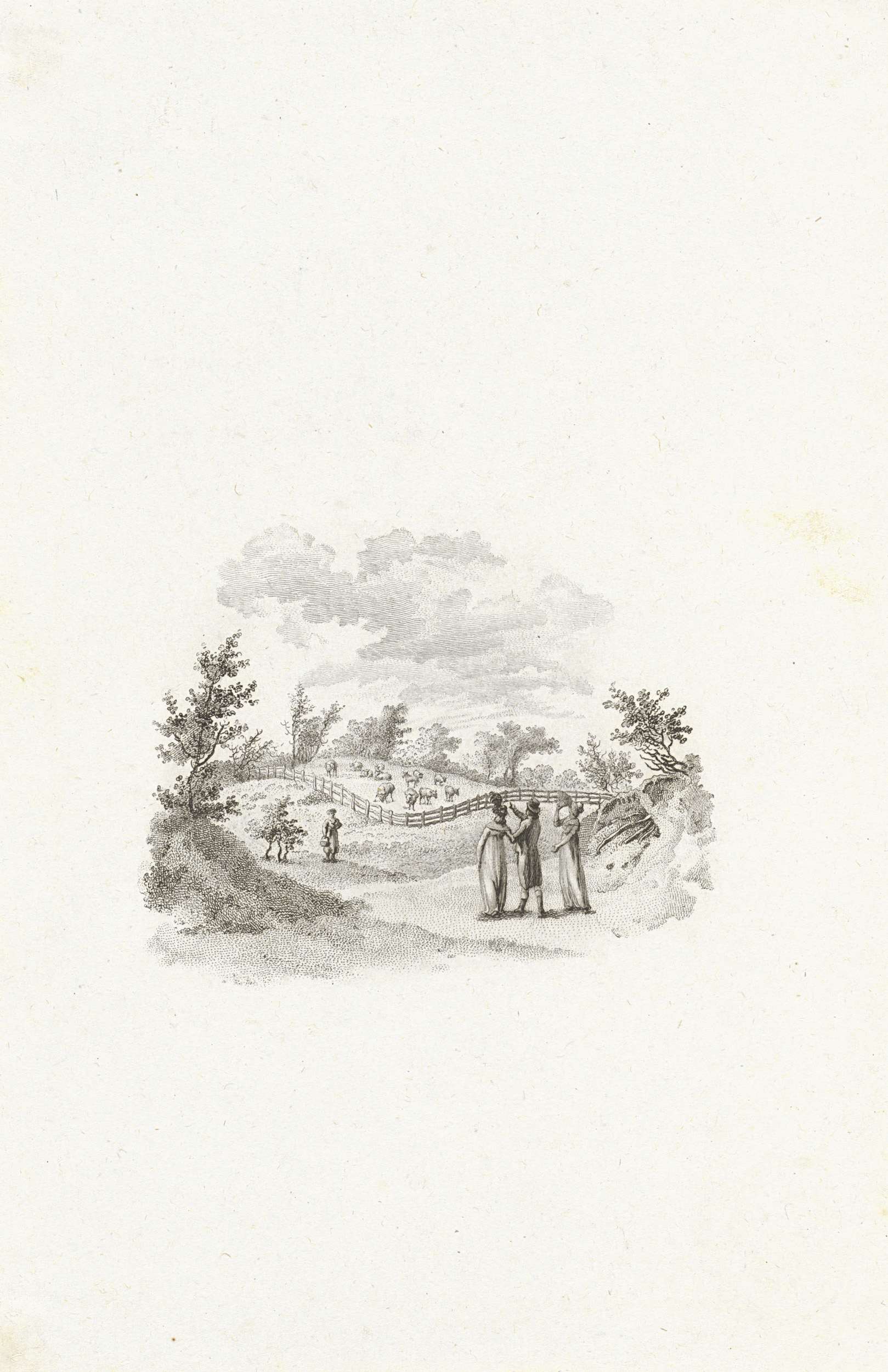 Landschap met wandelaars bij een weide met vee