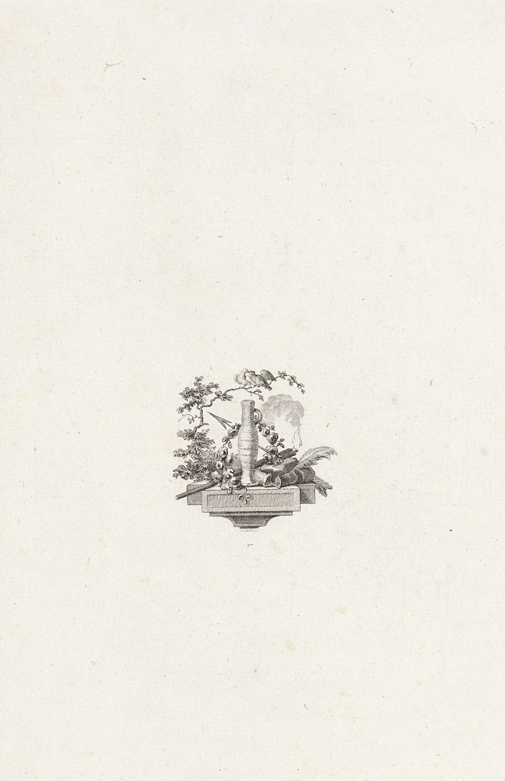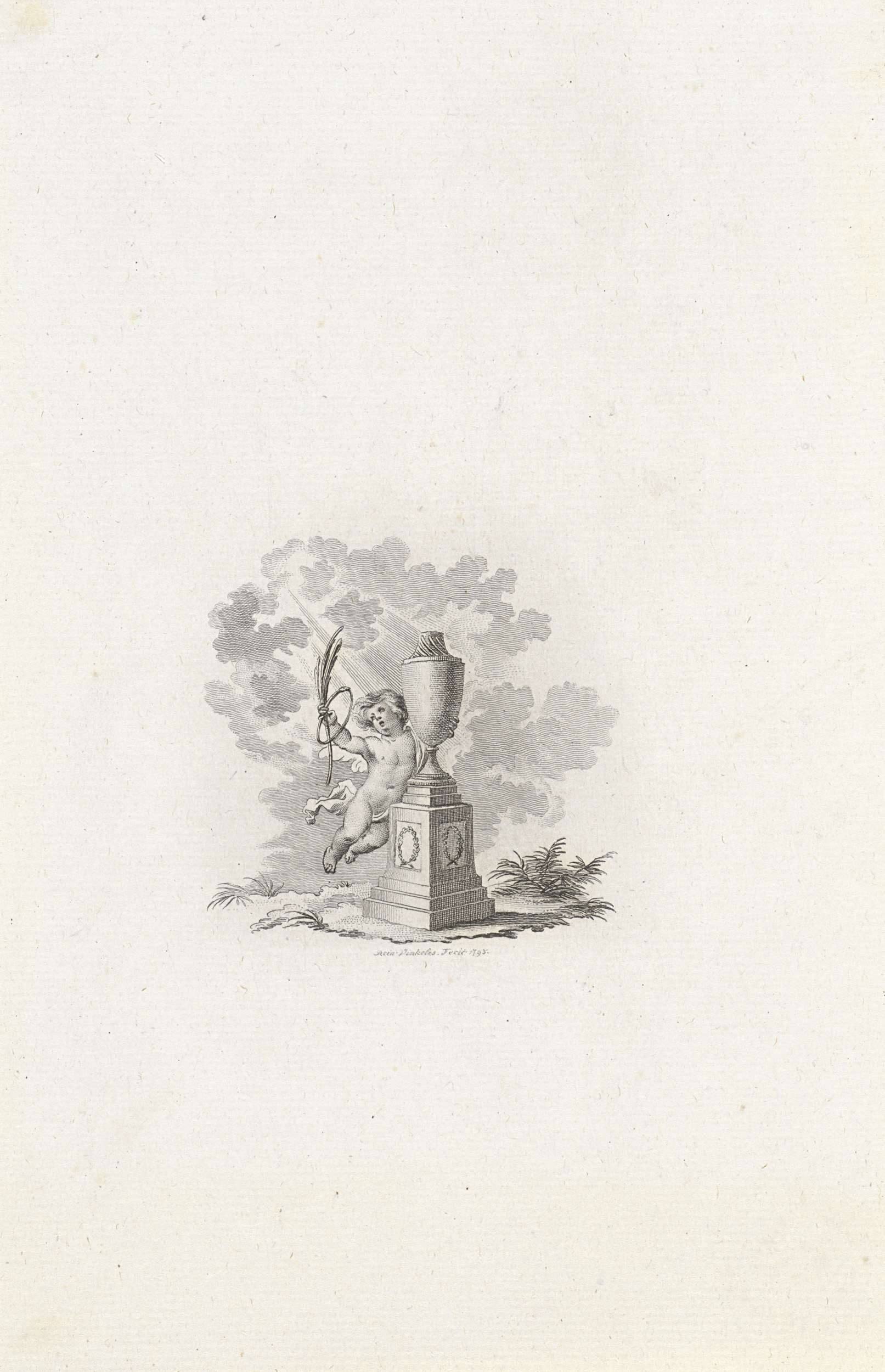 Vignet met putto met palmtak bij een vaas
