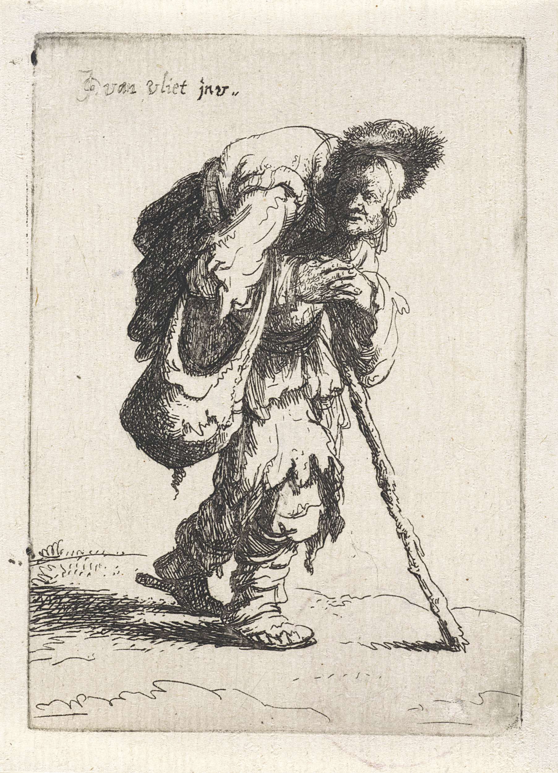 Gebochelde bedelaar met een wandelstok