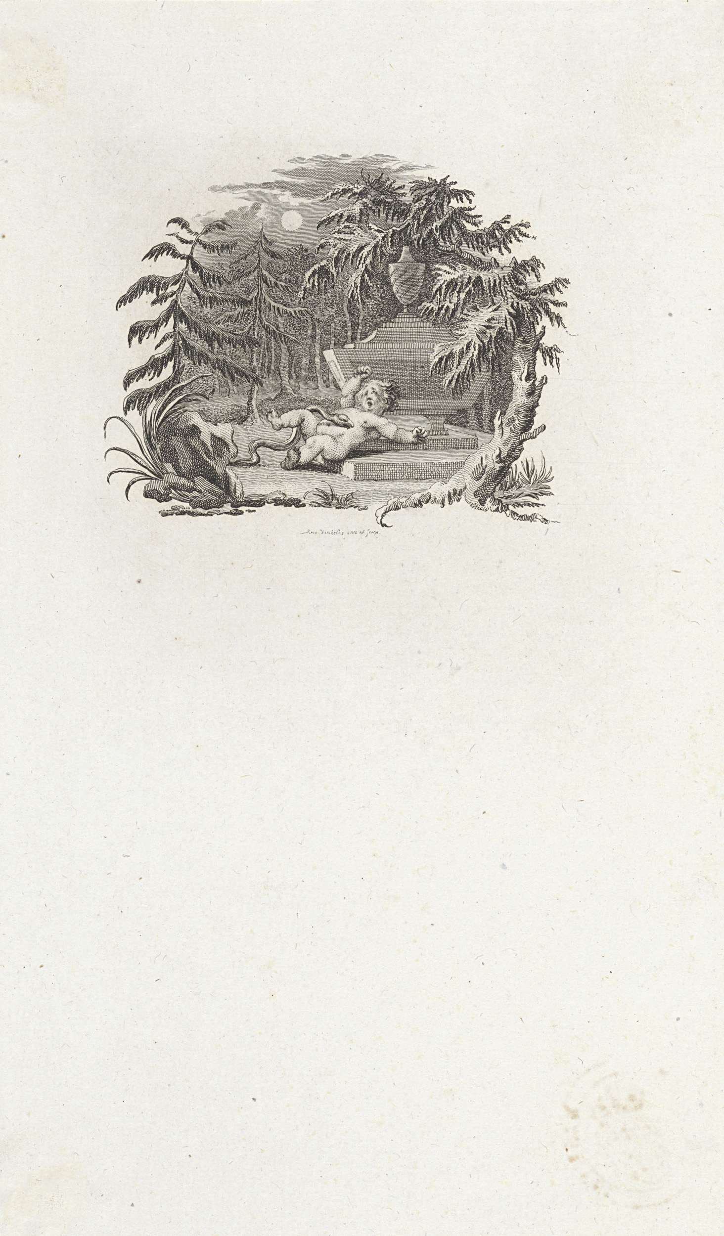 Vignet met een putto die bij een graf in het bos wor...