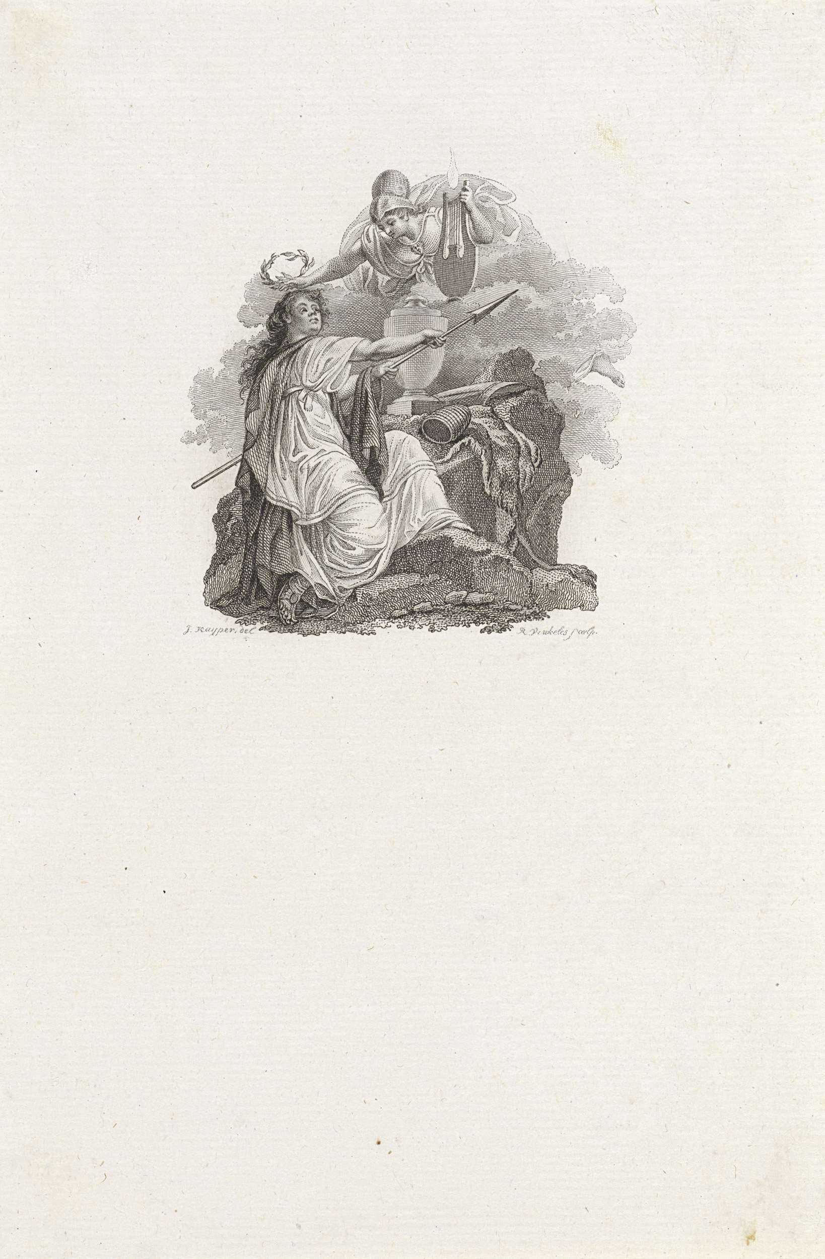 Vignet met een vrouw met lans gekroond met lauwerkrans