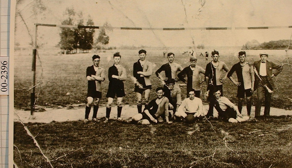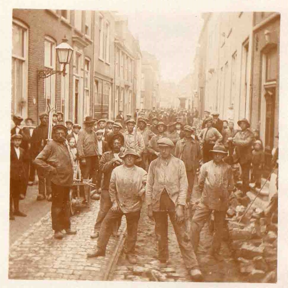 Foto, voorstellende arbeiders bij tramrails, Slotstr...