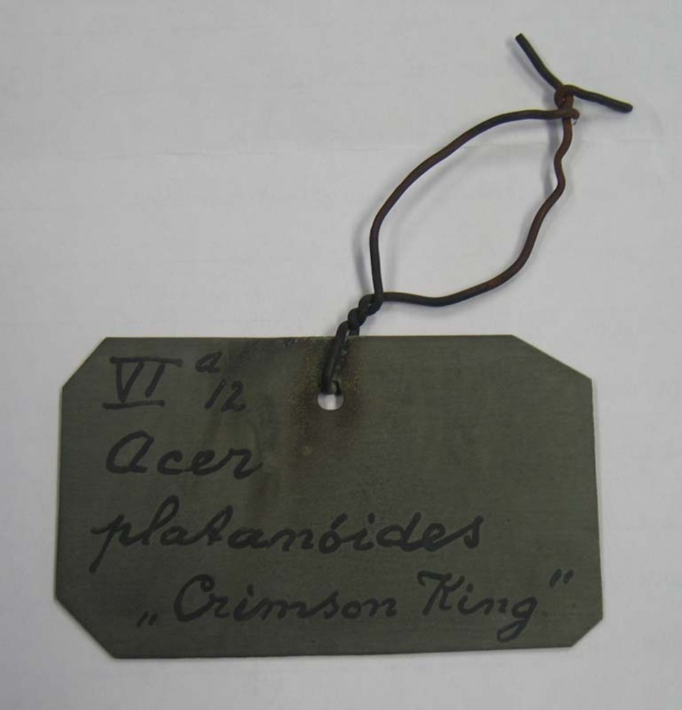 Naamkaart Acer platanoides Chrison King. van zink, a...
