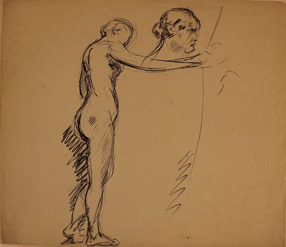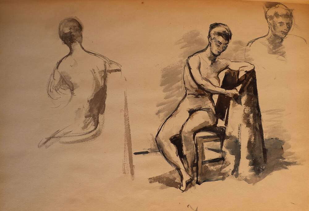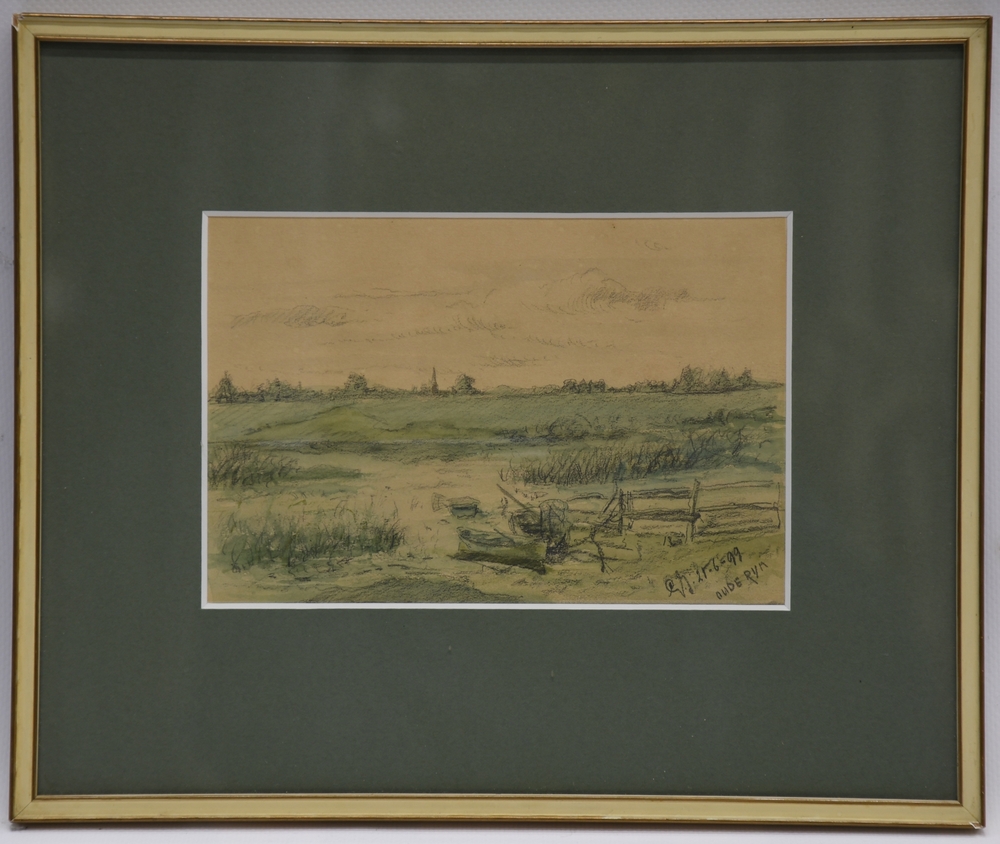 Aquarel met potlood op papier met titel 'De Oude Rij...