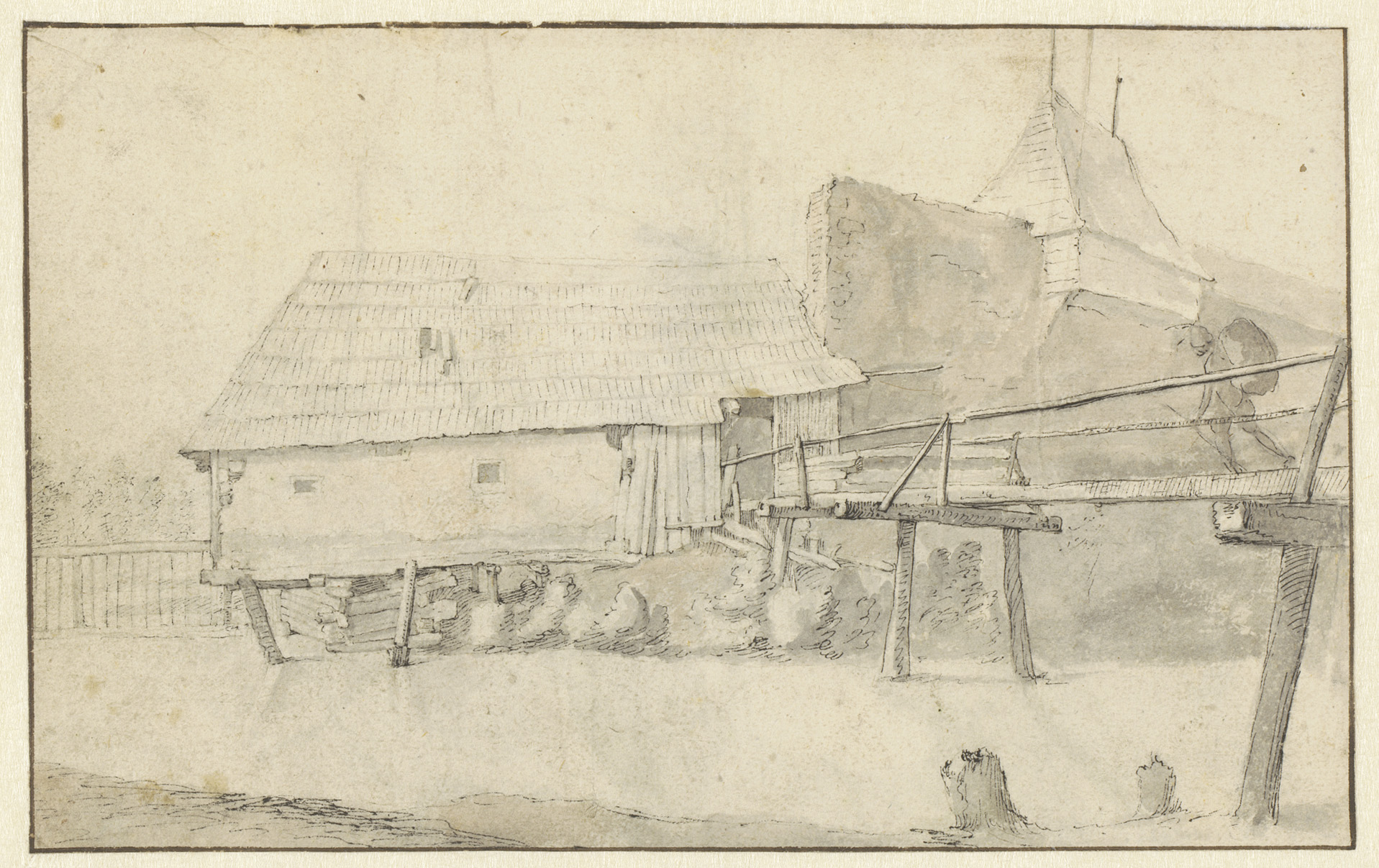 Een ongeïdentificeerde ruïne in Rome; op de achtergr...