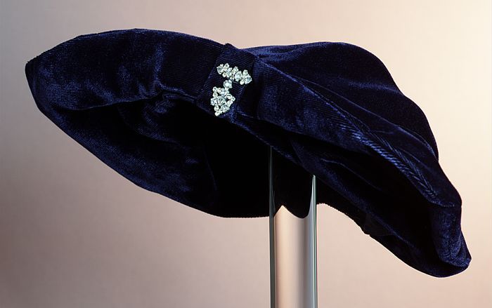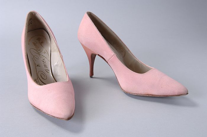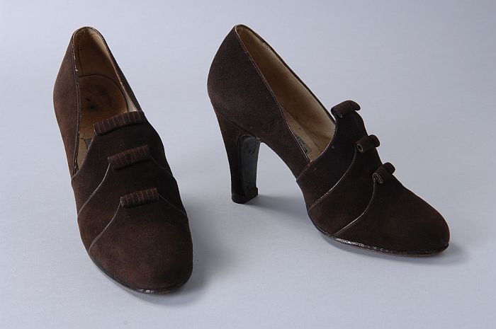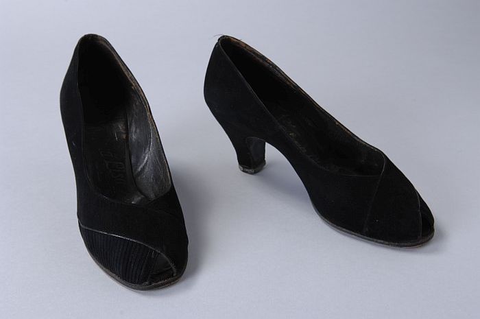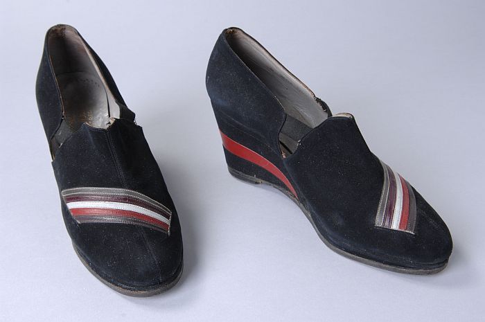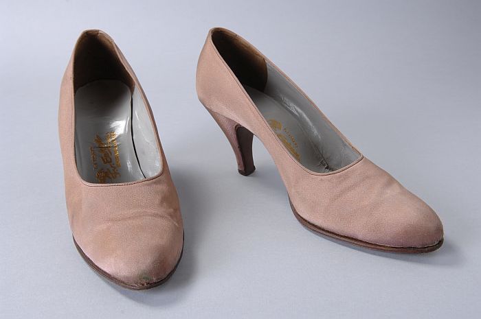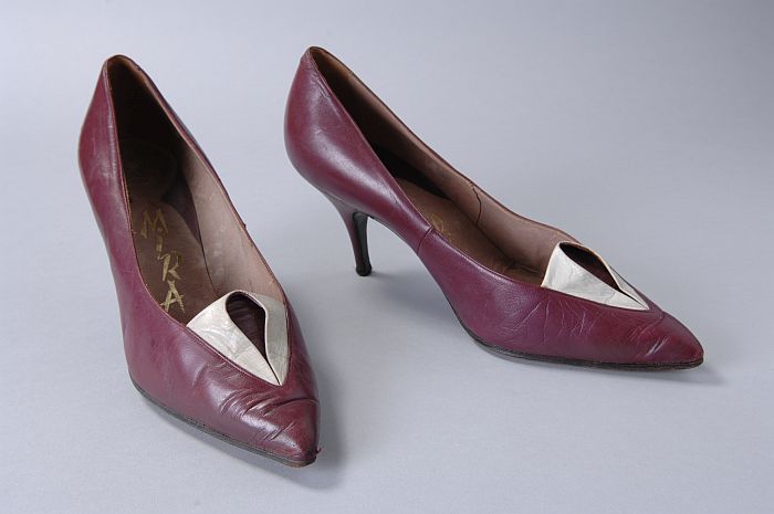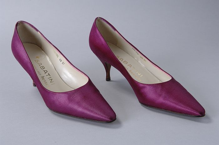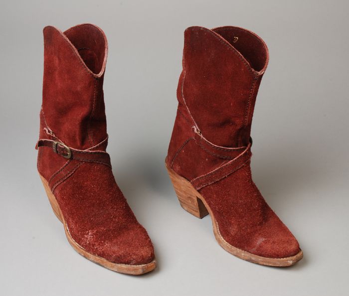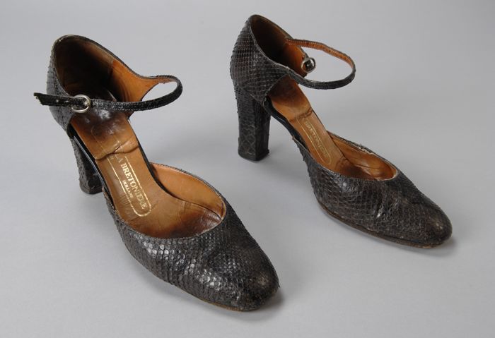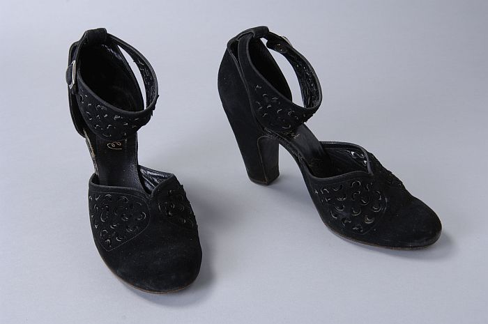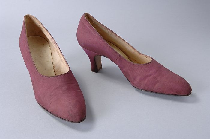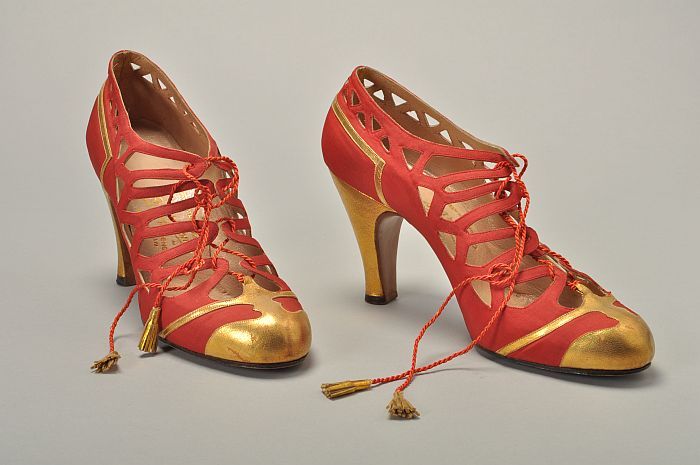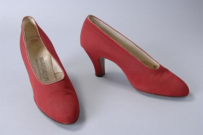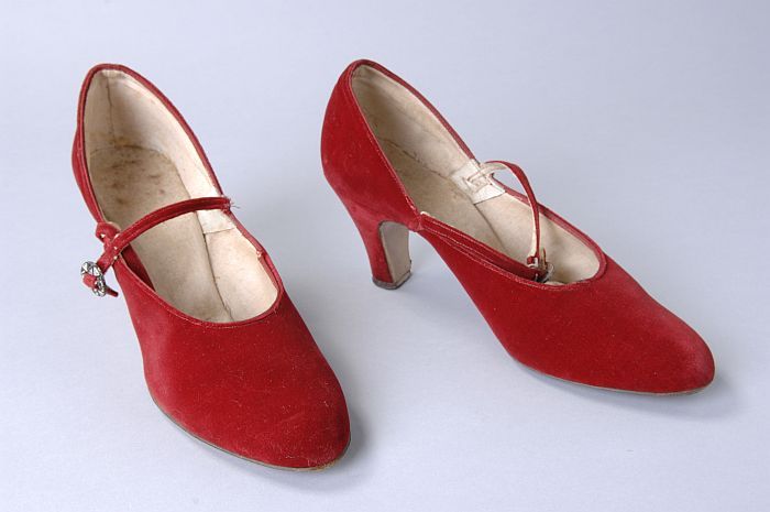 Rode fluwelen hakschoenen, gespjes met strass-steent...