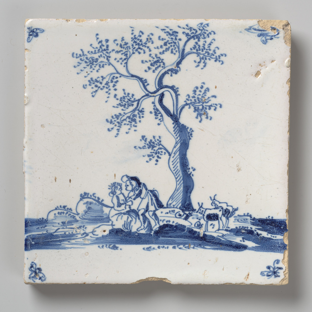 tegel van aardewerk met tinglazuur, voorstellende: b...
