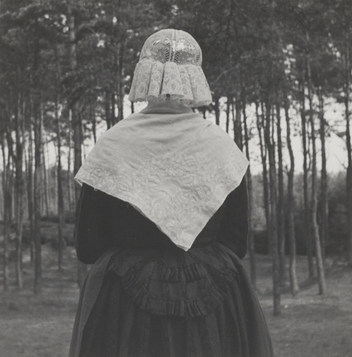Vrouw verkleed in Drentse dracht, 1948 (zwart-wit foto)