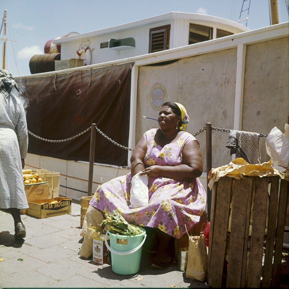Antilliaanse vrouw met koopwaar op de markt