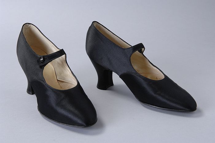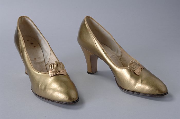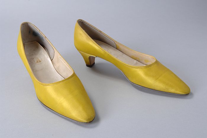 Pumps van hardgeel satijn met klein hakje en lange p...