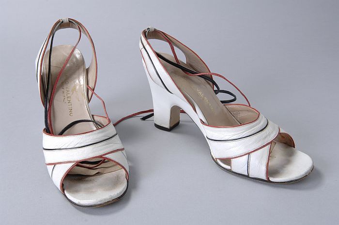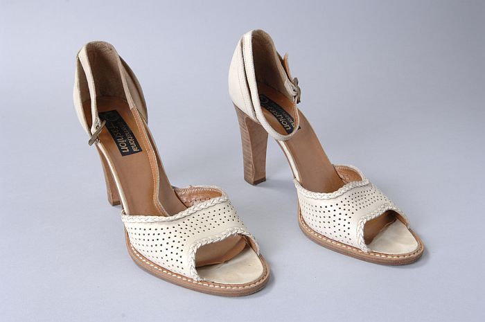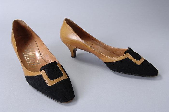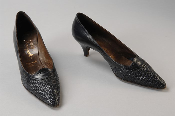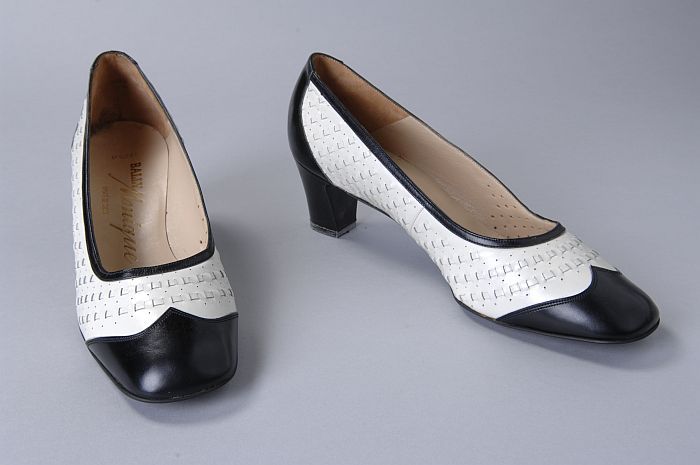Pumps van wit en zwart leer, witte gedeelte gevlocht...