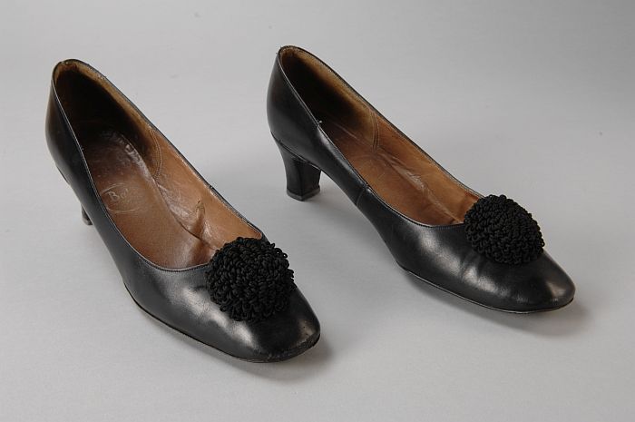 Zwart leren pumps met een zwarte pompon van lusjes o...
